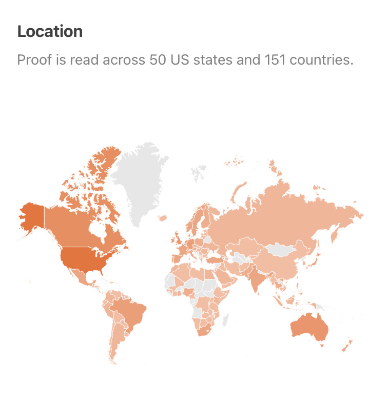According to Substack data analytics, Proof is read “across 50 U.S. states and 151 countries.” See the image below for a map of this substack’s international readership: