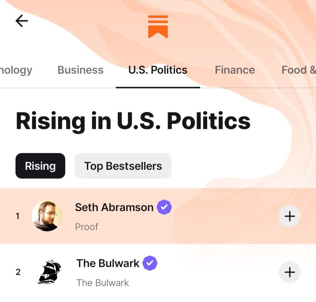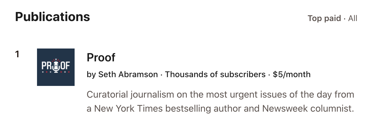 {Note: For those curious, the sixteen top-ranked single-author Politics substacks are run by people Proof admires: Heather Cox Richardson, Andy Borowitz, Joyce Vance, Robert Reich, Steve Schmidt, Jim Acosta, Jay Kuo, Adam Kinzinger, Mary Trump, Simon Rosenberg, Robert Hubbell, Dan Pfeiffer, Jessica Yellin, Jessica Craven, and Aaron Rupar. When full-size outlets—with staff writers—are included in the rankings, Proof ranks as the #32 Politics substack.}