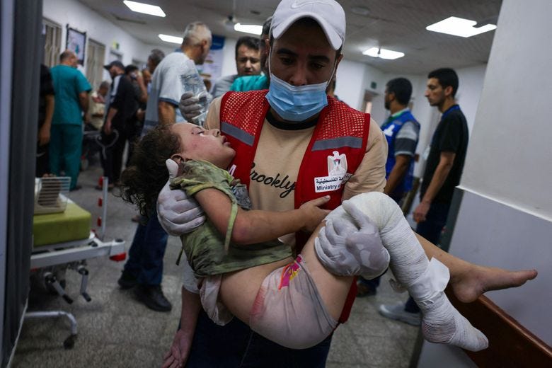 Moreover, Israeli attacks are much more likely than one might expect to strike at or near hospitals because, per IDF claims—as NPR details—“Hamas hides weapons and soldiers within and near hospitals and health facilities.” Is this true? It may or may not be, but certainly there’s no confirmation of the claim either way by either Hamas or the Israelis, with the result that the latter can justify any strike at or near a hospital facility by contending that it was a legitimate military target. NPR reports that “As of Thursday, the World Health Organization had documented at least 34 health care-related attacks—attacks involving health workers, facilities and ambulances—and warns that the health system in Gaza is at a breaking point.” NPR notes that at some hospitals the wait time even for emergency surgery is “days”, a macabre revelation that becomes more and more unthinkable the more one ponders it.