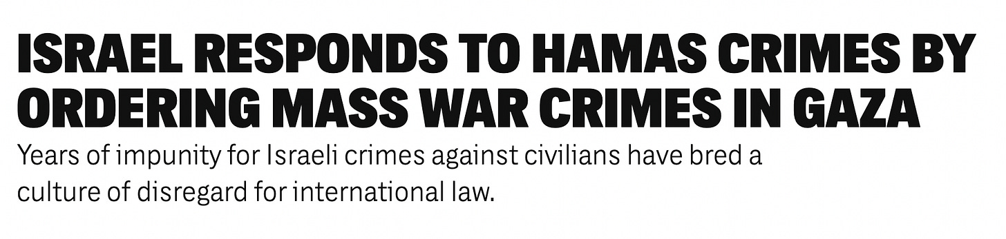 In the face of Hamas’s war crimes and Crimes Against Humanity—which clearly must result in the decimation of the terrorist group as quickly as possible—it will nevertheless be impossible for the Western world to ignore the war crimes and Crimes Against Humanity that appear to be unfolding inside Gaza at the hands of the IDF and the Netanyahu administration, acts that many Israelis demonstrably oppose.