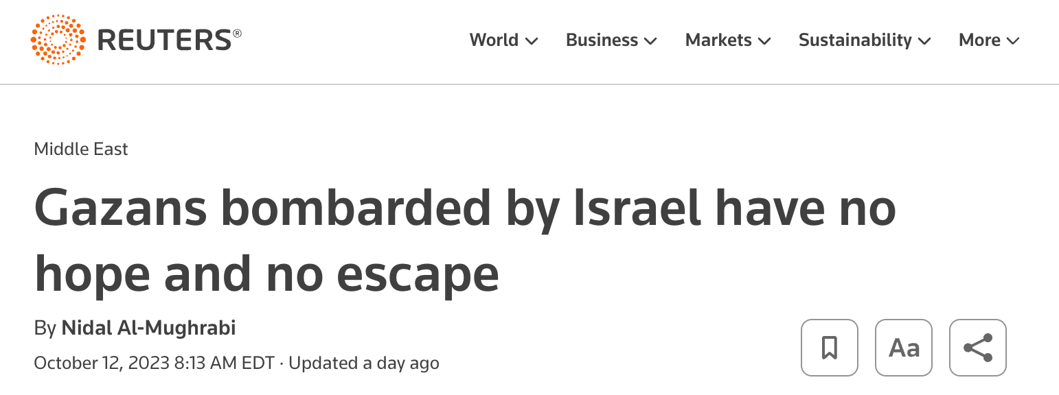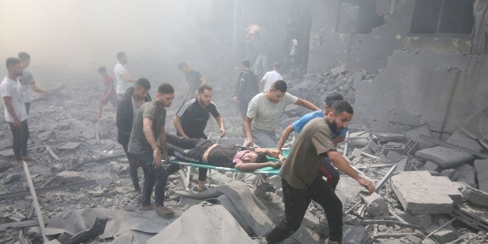Per CNN, in just six days Gaza has suffered at least “1,900” killed, significantly more than this injured, and at least “430,000 displacements”—a euphemism for innocent refugees who have nowhere to go because their homes are gone or are now unsafe.