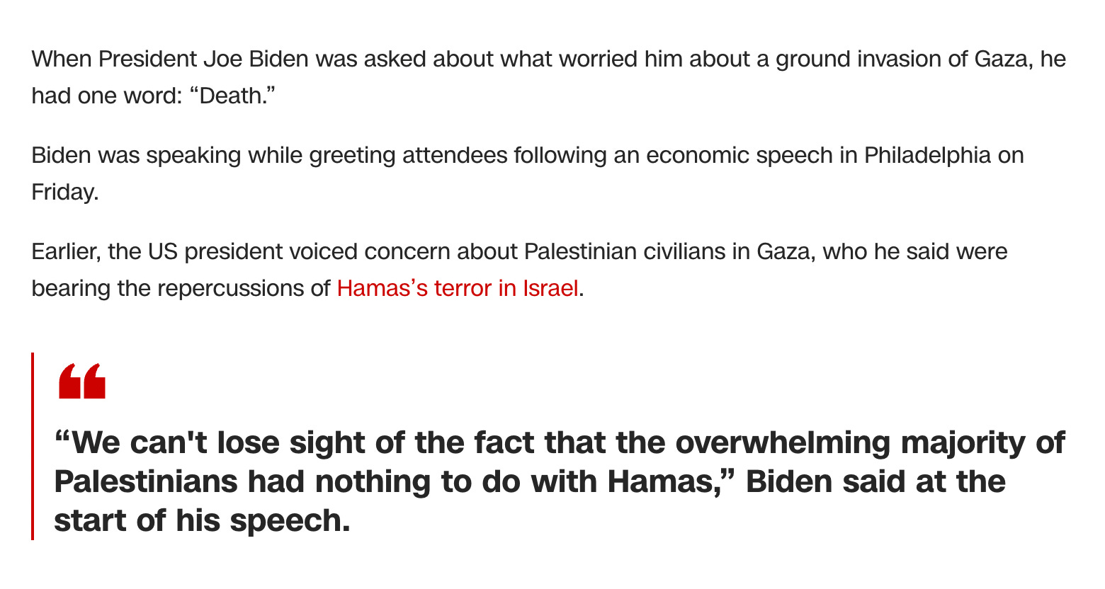 It doesn’t take a Literary Studies doctorate to see the bait-and-switch here. It may be the case that Hamas—a vile terrorist organization that clearly must be destroyed, at this point, by any means acceptable under international law—does comprise “human animals”, but Minister Gallant hasn’t limited his preannounced war crime to Hamas, but expanded it to the 75 out of every 76 Gazans who have nothing to do with Hamas.