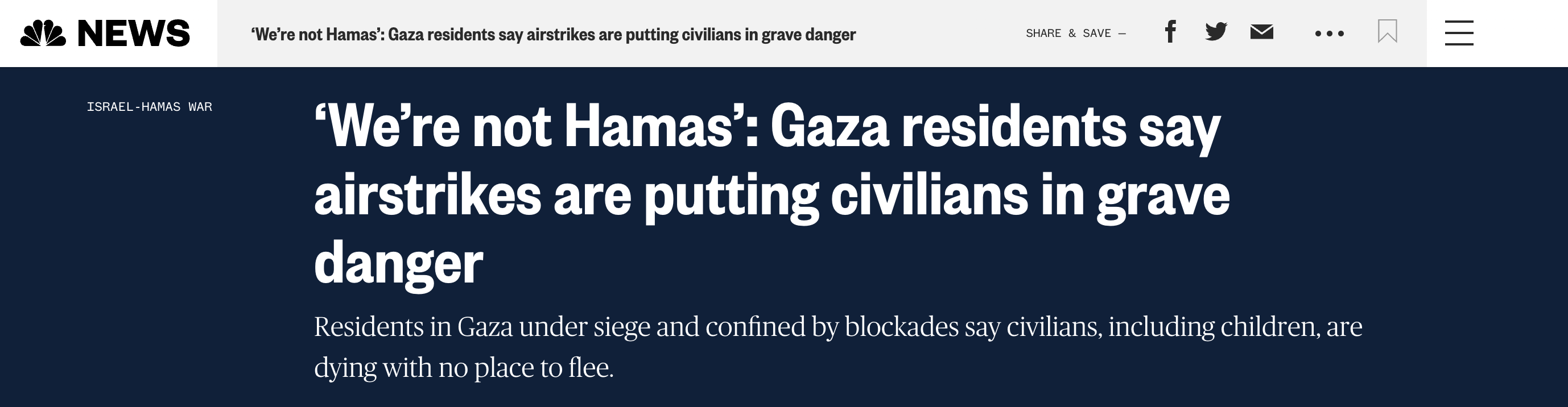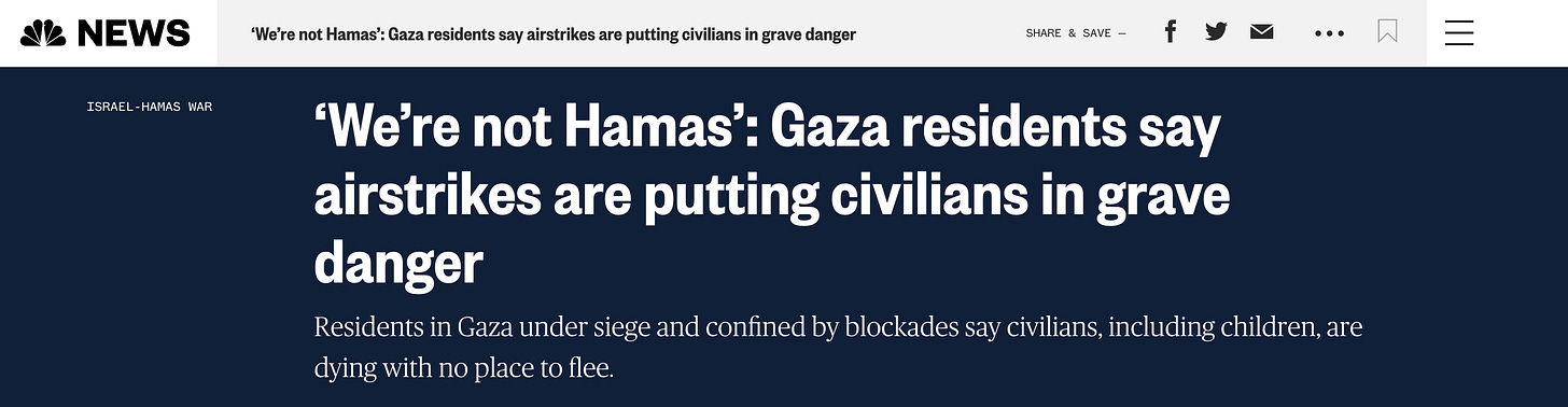 The other 75 people out of every 76—99% of the population of Gaza—have no Hamas affiliation whatsoever, and opposed Hamas’s militancy at a 70% clip even before the group’s unprecedented invasion of Israel led to Gaza staring down utter destruction.