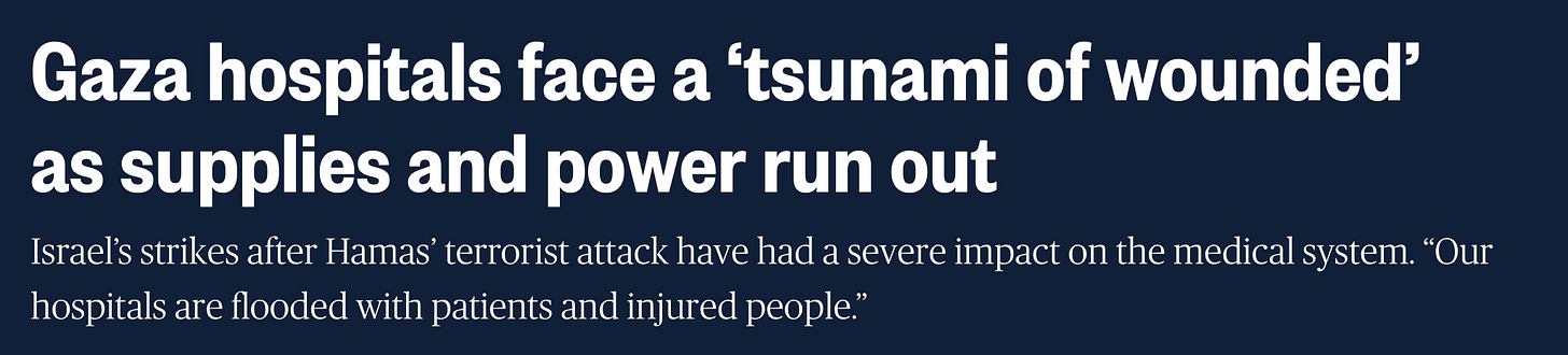 But this horror aside—facing hundreds or even thousands of airstrikes from one of the strongest militaries in the world while living in darkness, all because a terrorist group whose militarism you and 70% of your neighbors categorically oppose, which you didn’t democratically elect, committed heinous war crimes in a neighboring administrative state—the lack of electricity in Gaza cannot be discussed without acknowledging that hospitals run on electricity. Sitting in darkness waiting to be bombed is one kind of horror; being a doctor or nurse trying to save the life of a child with shrapnel in his stomach without access to electricity is the stuff of nightmares.