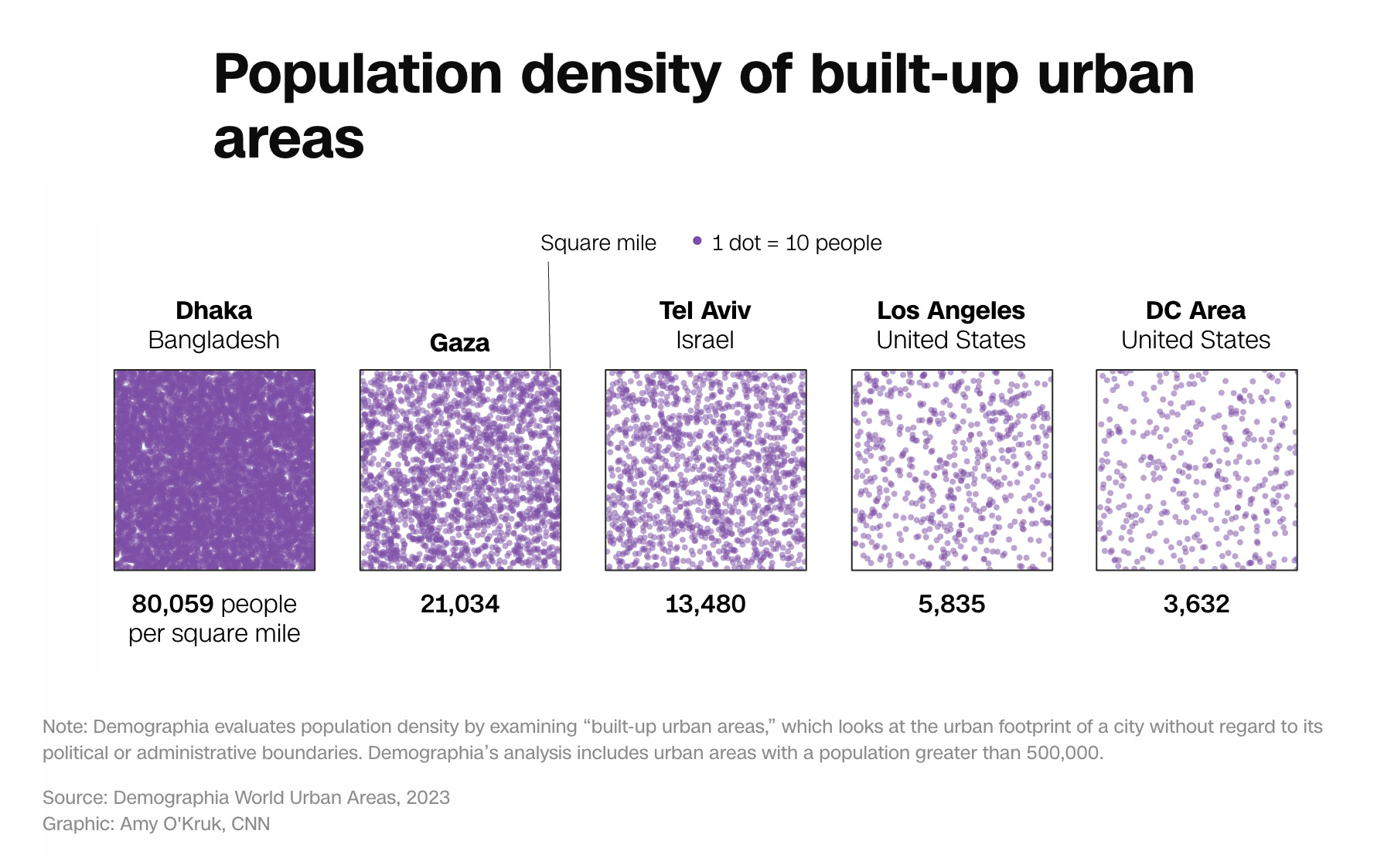 About half of the 2.3 million residents of Gaza are children. Even before the Israel-Hamas War began, 70% of Gazans wanted Hamas to disarm—but were (and still are) in no position to make it happen. The Gaza Strip is so small that it’s approximately the size of two Districts of Columbia, even as its “built-up urban areas” are six times more densely packed than America’s capital city (see graphic below).