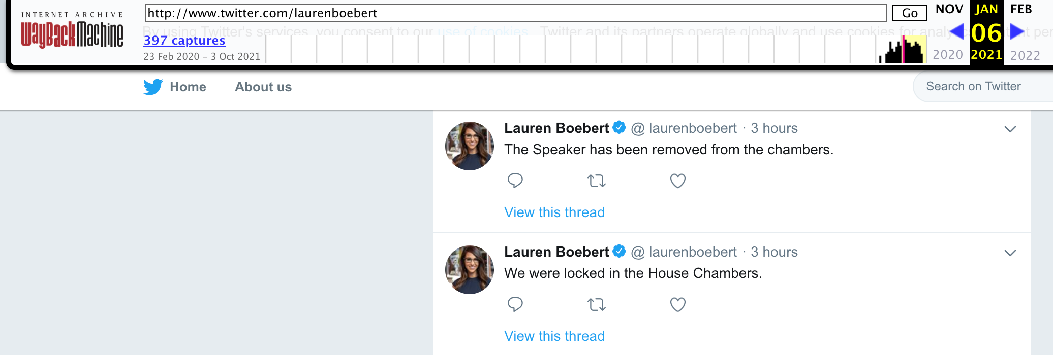 And this (below) is what she was doing while the Capitol was under attack: describing the movements of the intended victims of the attack, including “tyrants” she’d later rail about and demand that far-right Americans “get rid” of.