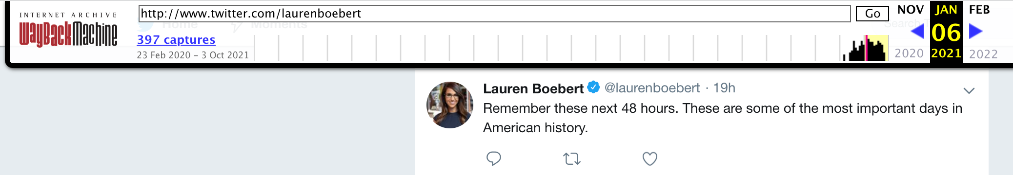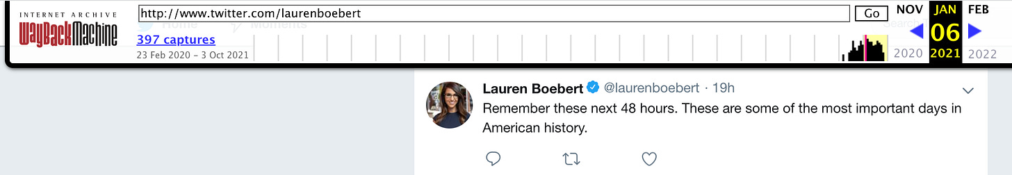 In the event, Boebert—just 48 hours into her tenure in Congress—unceremoniously cancelled on one trusted Trump adviser (Gorka) and the bevy of top Trump allies and advisers then gathering at Freedom Plaza (including onetime, current, and/or future Trump confidants Stone, Papadopoulous, Jones, and O’Handley). It begs the question: what sort of conflicting event could make a brand-new congresswoman seeking to gain favor with Trump’s inner circle cancel on prior commitments to attend events featuring five top Trump advisers? What sort of intervening event(s) took up so many hours of Boebert’s Insurrection Eve schedule that it kept her busy from 4PM through at least 9PM (notably, the period all Trump’s Insurrection Eve war rooms were active)?
