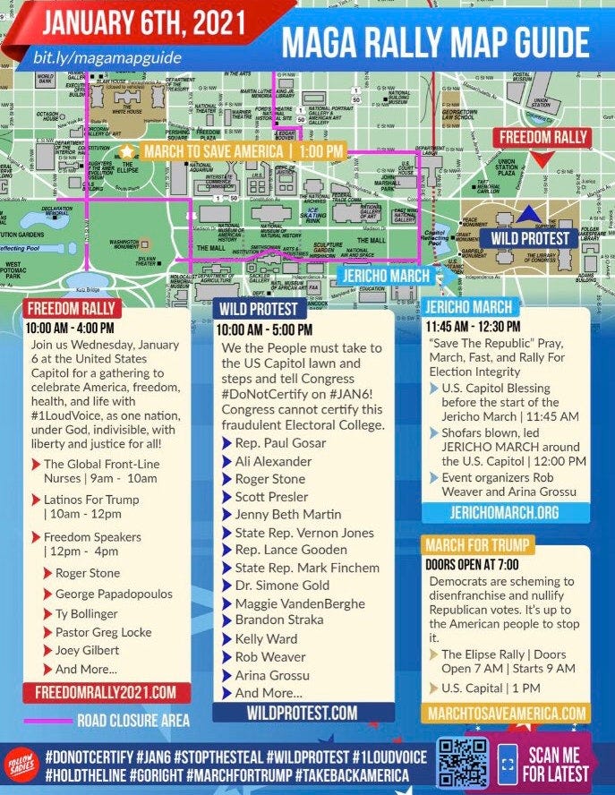 During this period Boebert was evidently in conversations, behind the scenes, about appearing at insurrectionist events in January—as per a federal permit application filed on January 3, she had by that date agreed to speak at the Insurrection Eve Rally for Revival jointly being put on by Stop the Steal and the domestic-extremist Eighty Percent Coalition (avid supporters of both the Proud Boys and the Oath Keepers, as discussed here at Proof in the past; the founder of the Eighty Percent Coalition, Cindy Chafian, is the very person who both put Boebert on her permit application and gave a speech supporting the Proud Boys on Insurrection Eve at the event she had invited Boebert to speak at). The planned location for Boebert’s speech was Freedom Plaza, not far from both the White House and the Capitol. The Congresswoman was due to speak alongside all of the following (a non-exhaustive list):