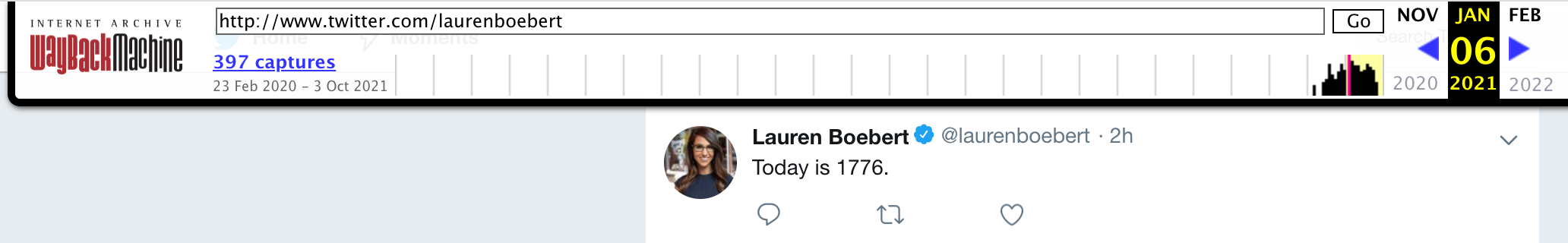What we do know is that whoever Boebert met with on Insurrection Eve—whether it was Donald Trump, other members of the Trump family, leading seditionists like her House GOP peers Gosar and Gooden, grassroots insurrections like Rogan O’Handley, or the man who preceded O’Handley on stage at the Rally to Revival, Ali Alexander—this is what she was tweeting to nearly 400,000 followers on the afternoon on January 5: