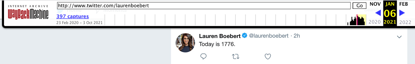 So the question of whether Boebert was with Trump, any member of Trump’s family, or any member of his administration, at a “strategy” meeting the night before she had a front-row-center seat to the most important and incendiary speech of Trump’s life is a consequential one indeed. Did the “strategy” involve tours of the Capitol? Did it call for her to incite her hundreds of thousands of Twitter followers with the call-to-arms slogan, “Today is 1776”? Did it involve giving out the location of members of Congress as the building they were in was under armed attack? Whatever the “strategy” was, it was worth Boebert cancelling multiple appearances with high-level Trump insiders in order to help develop it.
