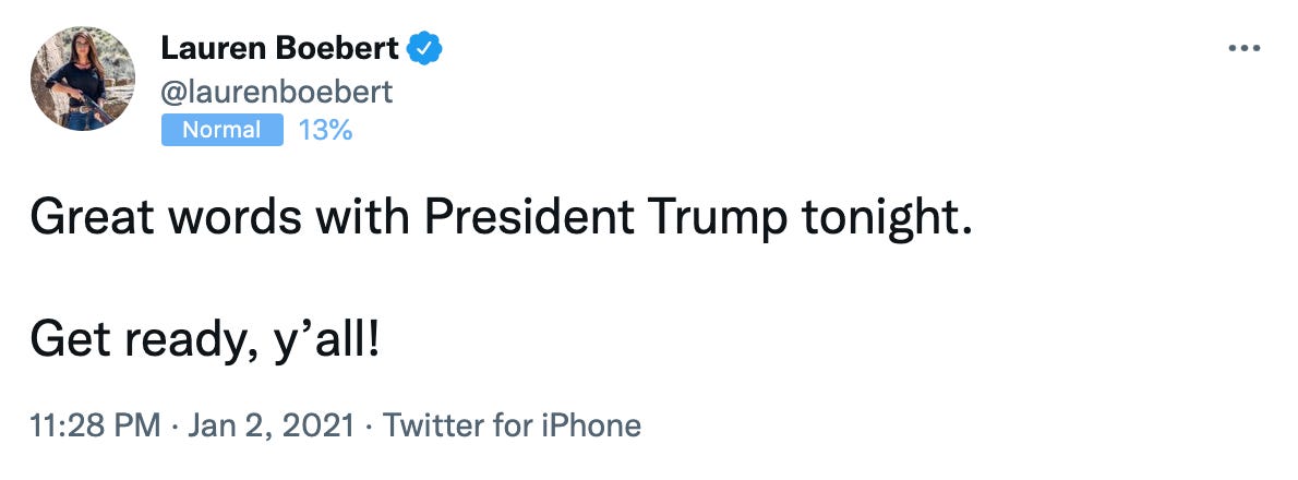 While Proof long ago reported exclusively on a major GOP conference call involving Trump on January 2—on the weekend before the attack on the Capitol—the Boebert tweet below suggests a more intimate, direct exchange with the president on that day: