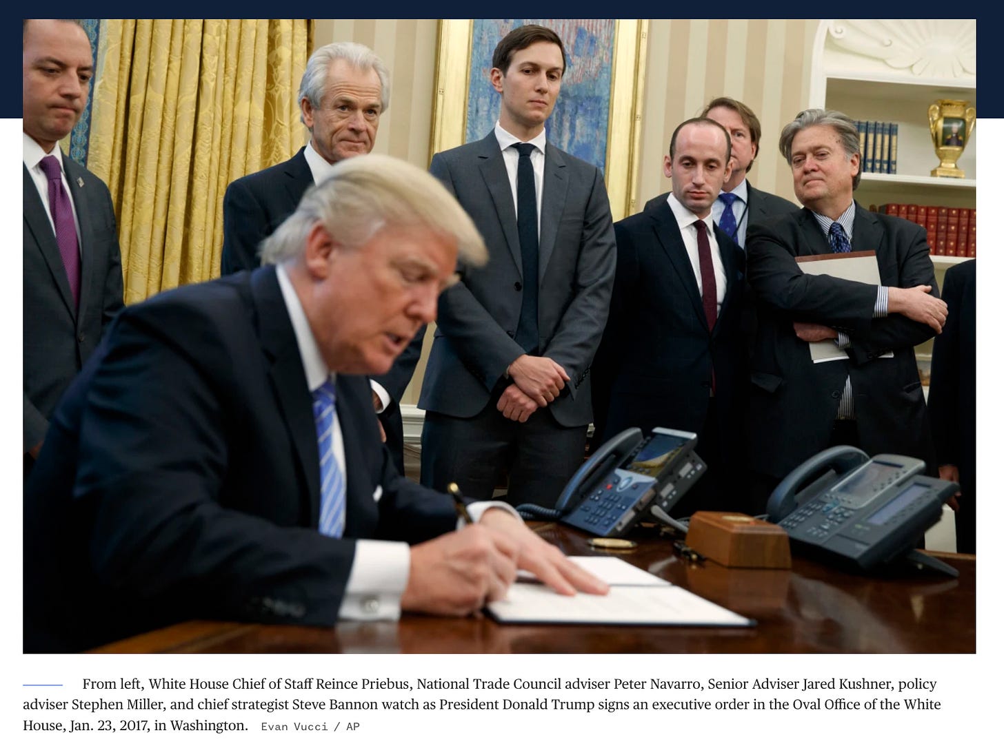 Whereas Peter Navarro—and, for that matter, virulent racists in Trump’s inner circle like Steve Bannon and Stephen Miller—looked on in satisfaction as President Trump dumped the TPP on January 23, 2017, and while Navarro would continue declaiming his “well outside the mainstream” views on China into 2019 and beyond, the arrival of Greenberg in Trump’s milieu (after what appear to have been years of ties between the Trumps and Greenbergs) caused Trump to realize, in the latter half of his only term, that (a) as he already had most of the China-hating white supremacists in the United States on his side, and (b) his fans would follow him with fanatical zeal no matter what he said or did, it might be time for him to (c) negotiate a sort of détente with the pro-free-trade business leaders who had wanted him to expand rather than restrict trade with China from the beginning.
