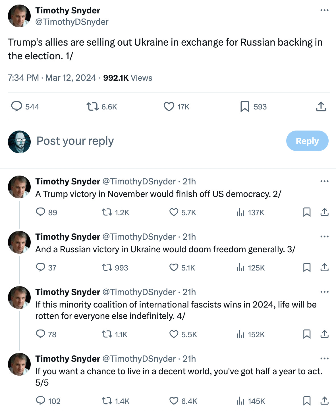 Snyder’s primary academic focus in on Russia, Ukraine, and the state of democracy in Eastern Europe broadly writ—as well as the larger question of why some democracies thrive while others fail, a topic he addresses in his bestselling 2017 book On Tyranny, published three years before my own bestselling book on Russia and Ukraine, Proof of Corruption (Macmillan)—so his commentary on how the Russia-Ukraine War will inflect the 2024 U.S. presidential election is listened to by basically everyone in D.C.