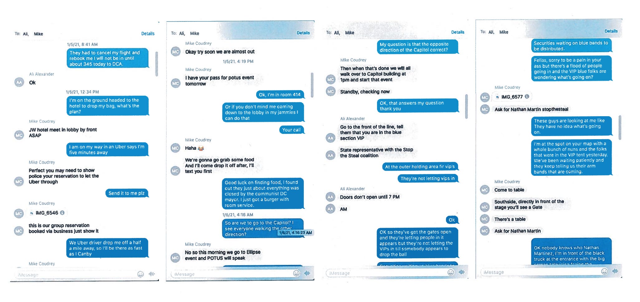 At least four things can be taken from this message and the manner in which it was written: (1) at some point Mark Finchem went from the hotel he was staying at (the JW Marriott) to the Willard, where Team Trump’s war room was, making him at least the third Stop the Steal leader (Alexander has credited him with being the man who “started” the Stop the Steal movement in Arizona) to go inside the D.C. hotel where Trump’s comms center was; (2) Finchem met with the same Oath Keepers inside the Willard who had been guarding Stone (as only one golf-cart ride from the Willard to the Capitol is known to have occurred at the time referenced in the federal indictment against Oath Keepers Roberto Minuta and Joshua James), increasing substantially the odds that Finchem was one of the “literally fifty” people that Roger Stone and Sal Greco were “hang[ing] out with” at the Willard while Trump lawyers Rudy Giuliani and John Eastman were in Trump’s “war room” there; (3) Finchem, who describes himself as an Oath Keeper, was sufficiently aware of the Oath Keepers’ operational plans for January 5 and January 6 that when he needed to get to the Capitol quickly he went to the Willard and made immediate contact with the Oath Keepers there; and (4) both Alexander and Coudrey were sufficiently aware of the Oath Keepers’ January operational details that Finchem could say “one of the golf carts” and no more and know that he would be immediately understood by other Stop the Steal leaders (in fact, the use of golf carts in downtown D.C. was so extraordinary that it could not have been blithely cited to anyone who didn’t have some foreknowledge of the possibility).