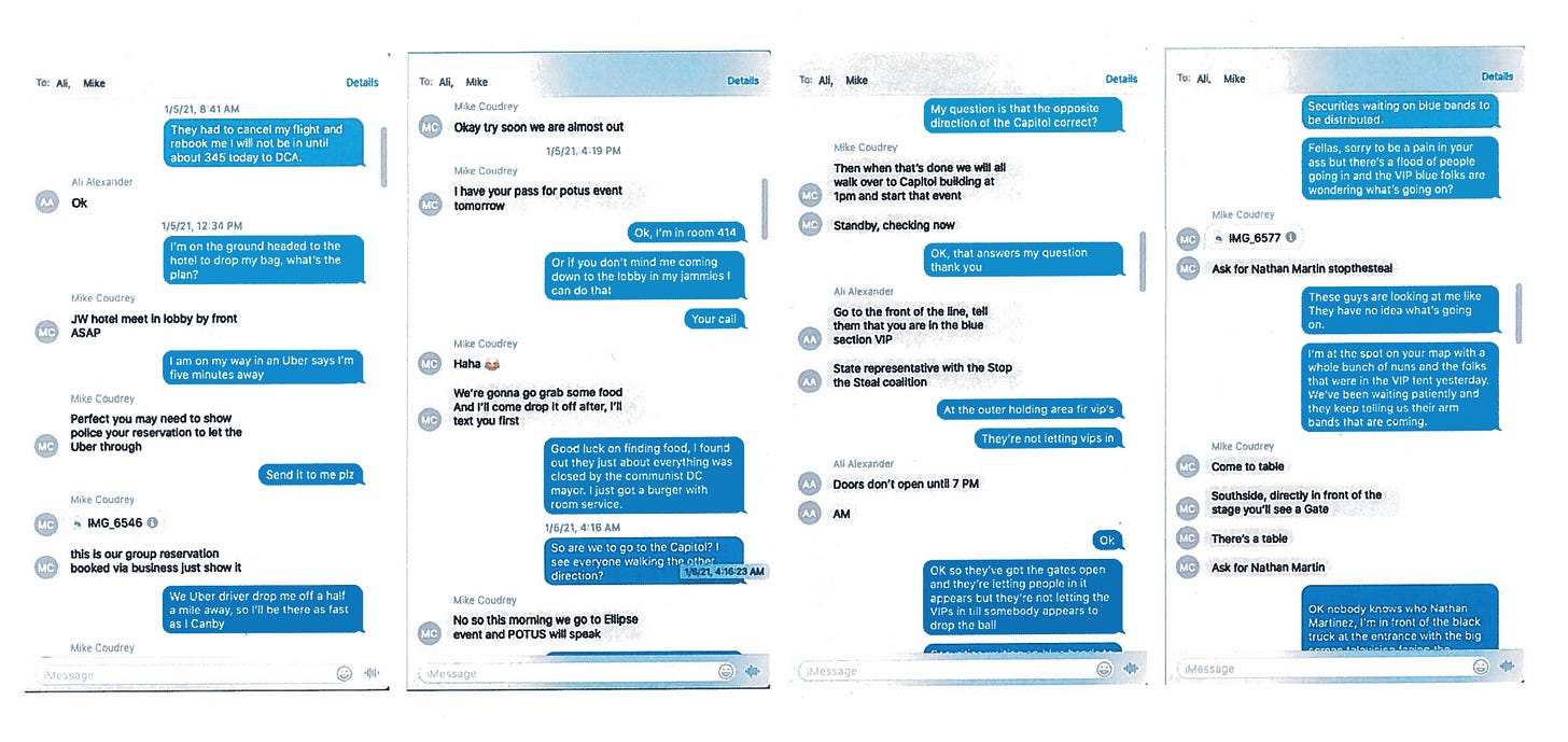 A large tranche of text communications between Arizona state representative Mark Finchem and domestic terror leader Ali Alexander, the latter of whom is presently in hiding from federal authorities, reveal that Alexander was in direct telephone contact with multiple United States senators on January 5, 2021—just 24 hours before what former United States Capitol Police chief Steven Sund has now called “a coordinated violent attack on the United States Capitol by thousands of well-equipped armed insurrectionists” and “a coordinated military style attack involving thousands.”1