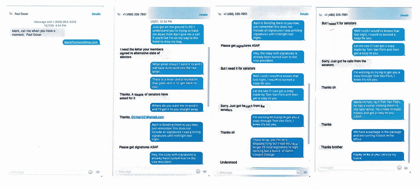In a conversation with Finchem that began at 12:34PM on January 5, Alexander urges Finchem to immediately send him a document confirming that a large number of GOP state representatives in Arizona would be willing to de-certify Biden’s Arizona electors and certify a new slate of (per experts, presumptively fraudulent and unconstitutional) Trump electors. Alexander refers to this document, in texting Finchem, as “the letter your members [fellow GOP legislators in Arizona] signed re[garding an] alternate slate of [Trump] electors.”