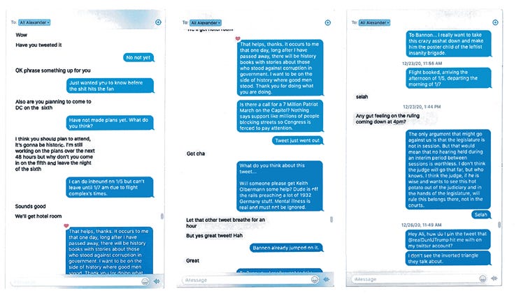 A tranche of texts between Alexander and an insurrectionist Arizona politician reveals new bombshells, including the location of the insurrectionists' war room on January 6—just 240 feet from Trump's.