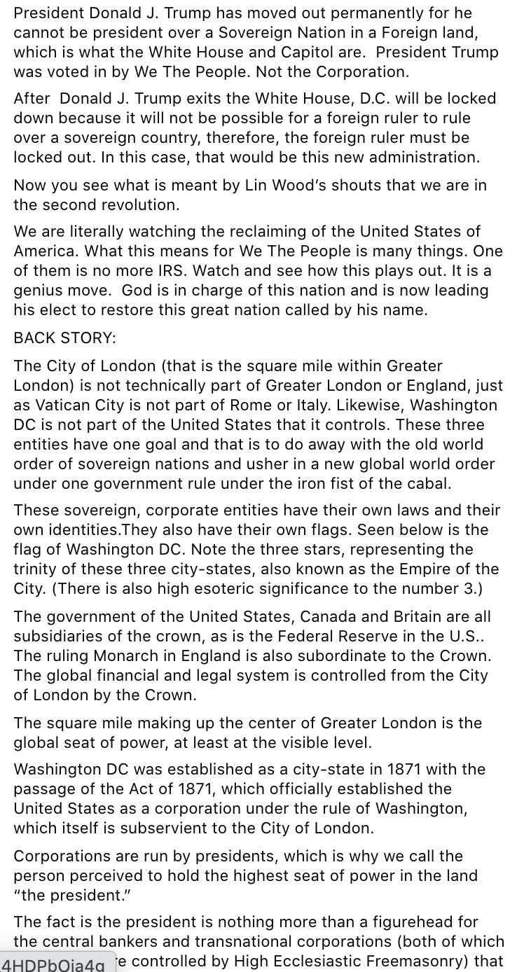 “President Donald J. Trump has moved out [of D.C.] permanently, for he cannot be president over a Sovereign Nation [the United States] in a Foreign land, which is what the White House and Capitol are. President Trump was voted in by We The People. Not the Corporation [of the United States of America]. After Donald J. Trump exits the White House, D.C. will be locked down because it will not be possible for a foreign ruler to rule over a sovereign country, therefore, the foreign ruler must be locked out. In this case, that would be this new [Biden] administration. Now you see what is meant by Lin Wood’s shouts that we are in the second revolution. We’re literally watching the reclaiming of the United States of America.”