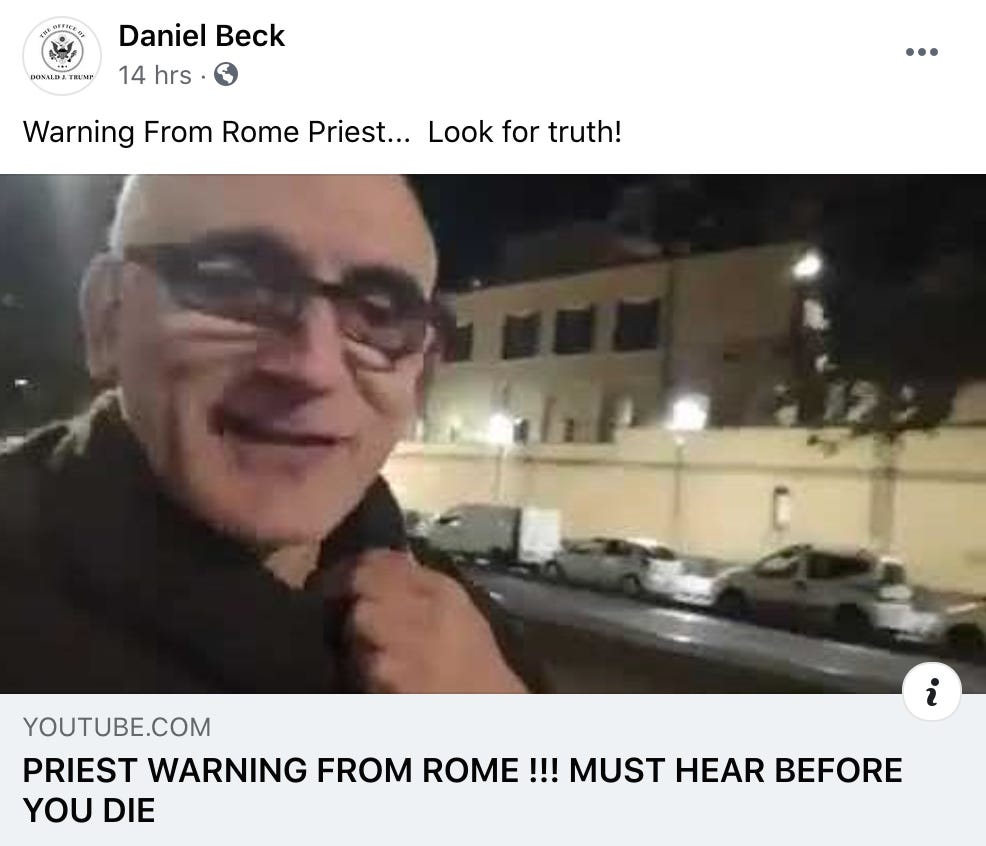 —video message from a Roman priest, posted and endorsed on Facebook by January 5 Trump International Hotel meeting attendee Daniel Beck on January 28, 2021 (Beck: “Warning From Rome [sic] Priest…Look for truth!”)
