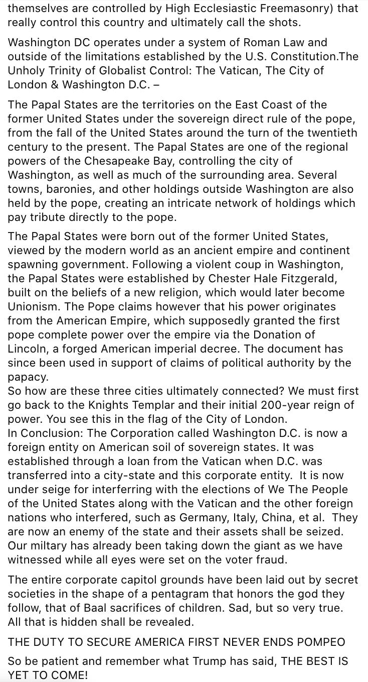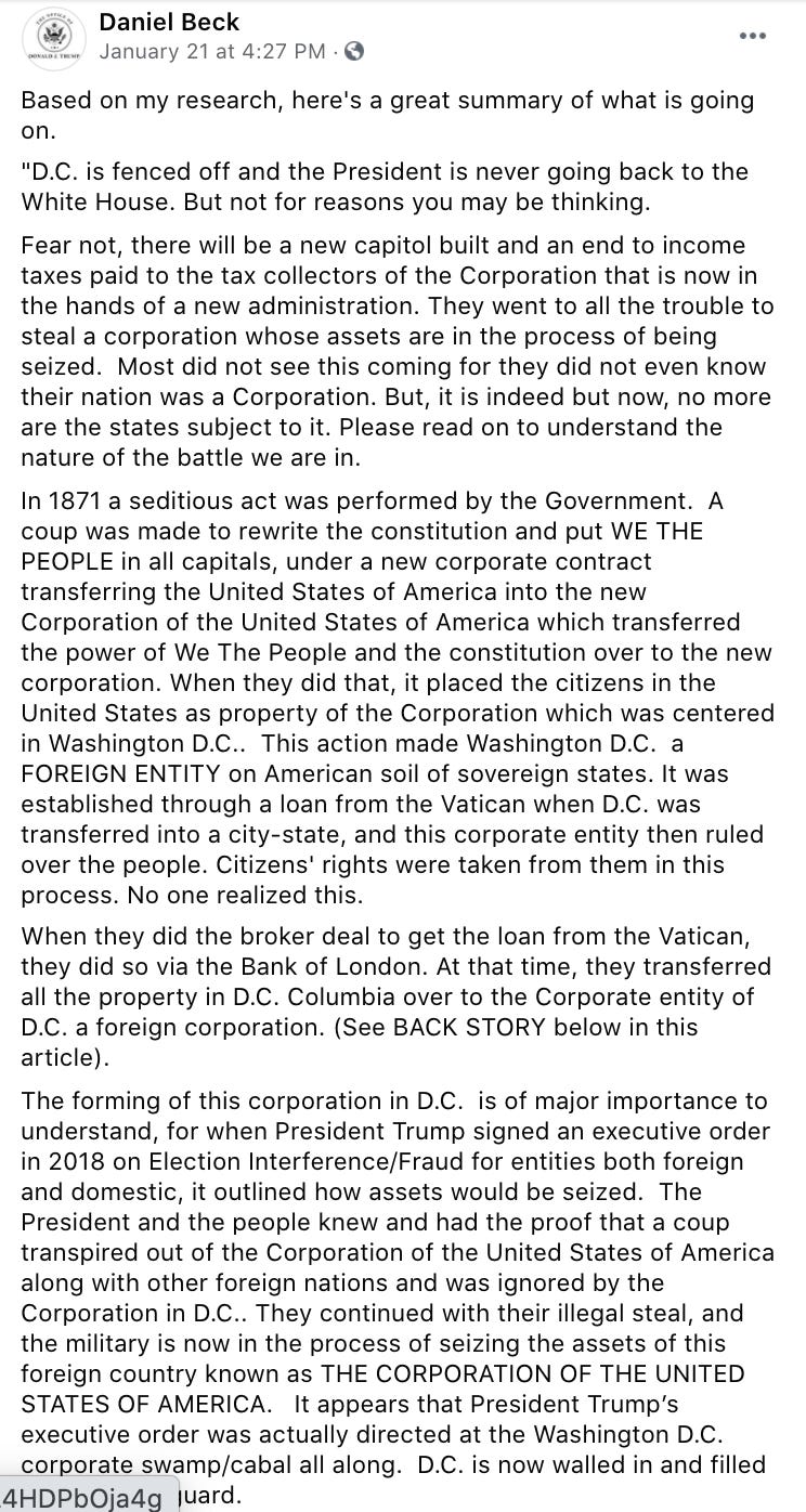 —deranged conspiracy theory about the United States illegally becoming a “corporation” in 1871, posted and endorsed on Facebook by January 5 Trump International Hotel meeting attendee Daniel Beck on January 21, 2021 (Beck: “Based on my research, here’s a great summary of what is going on”)