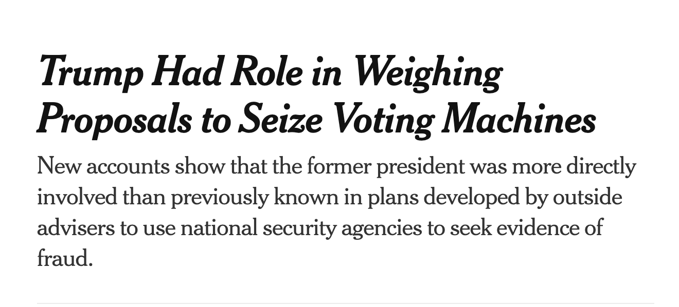 (6) In the lead-up to January 6, Trump was clearly game—ready to instrumentalize vague claims of foreign election interference to seize voting-machine data using federal soldiers and/or federal law enforcement officers.