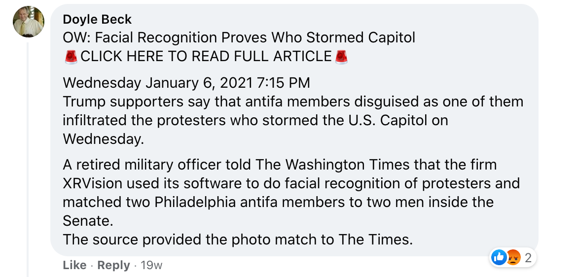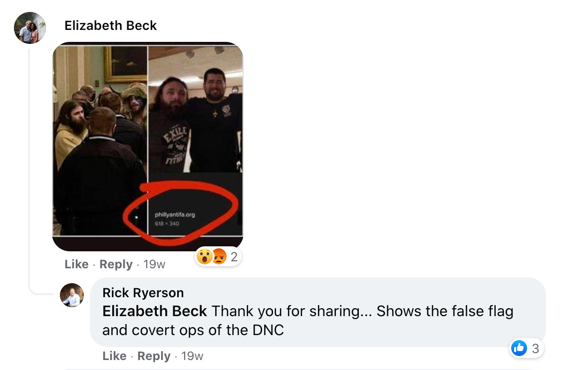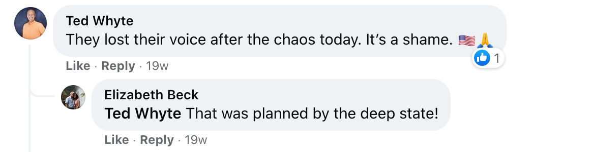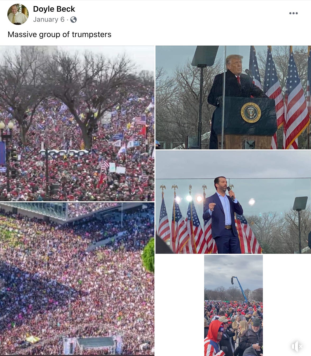 January 6: Beck shares photos and video from Trump’s White House Ellipse speech, he and his wife Elizabeth Beck spread the “antifa did it” conspiracy theory about the insurrection, and Doyle interacts with a violent insurrectionist.