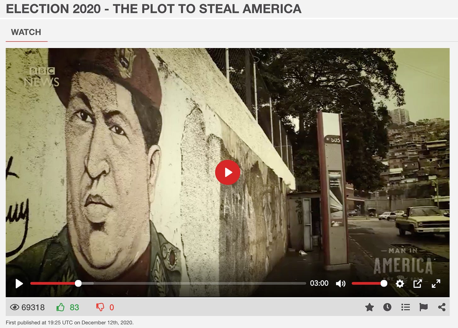 December 16: Beck shares a link to a seditious documentary called The Plot to Steal America, which falsely accuses Venezuela of using software to steal the 2020 election. Below is a still image from the documentary in which former Venezuelan dictator Hugo Chávez—dead since 2013—is shown. The man with whom Giuliani, Prince, and other Trump agents were secretly negotiating in Venezuela (Maduro) is Chávez’s successor, and indeed it is the mid-2010s election through which Maduro succeeded Chávez that Trump, his agents, and Team Kraken claim was the launch of an alleged “Dominion-Smartmatic-Clinton-DNC-Russia-Venezuela-China-Cuba” conspiracy.