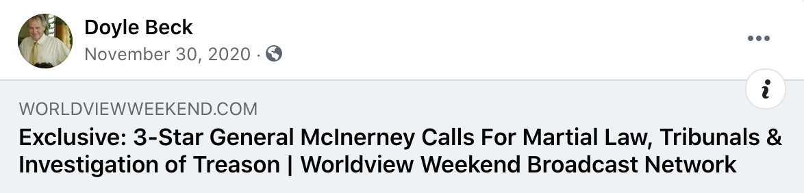 December 20, December 22, January 4, January 5, and February 5: On these dates (at a minimum) Doyle Beck either (1) shares tweets on his Facebook feed from accounts since deleted by Facebook for spreading election misinformation, (2) links to since-deleted election-disinformation or extremist websites, or (3) attempts to share links on Facebook subsequently blocked after Facebook fact-checkers conclude that they are election disinformation.