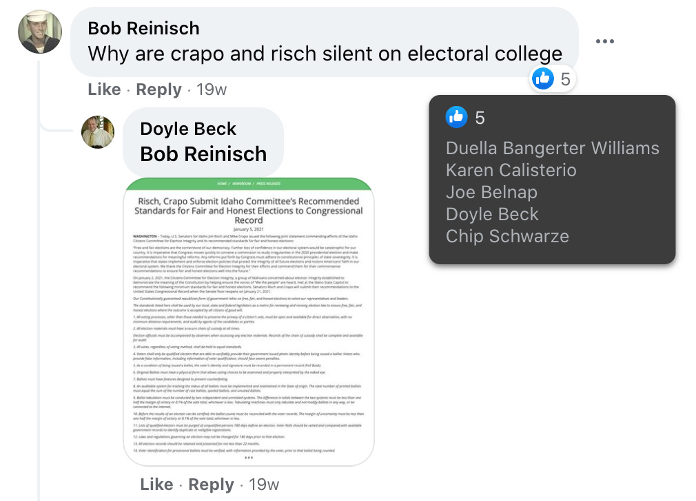January 5, 2021: Via a Facebook “like,” Beck implies that he believes that neither of Idaho’s GOP senators are with Trump’s attempted coup—thereby implying, as well, that neither Mike Crapo nor Jim Risch were at Trump International Hotel on January 5 supporting Trump’s coup plan (and therefore could not have been the reason that the Becks were allowed into Trump’s private residence).