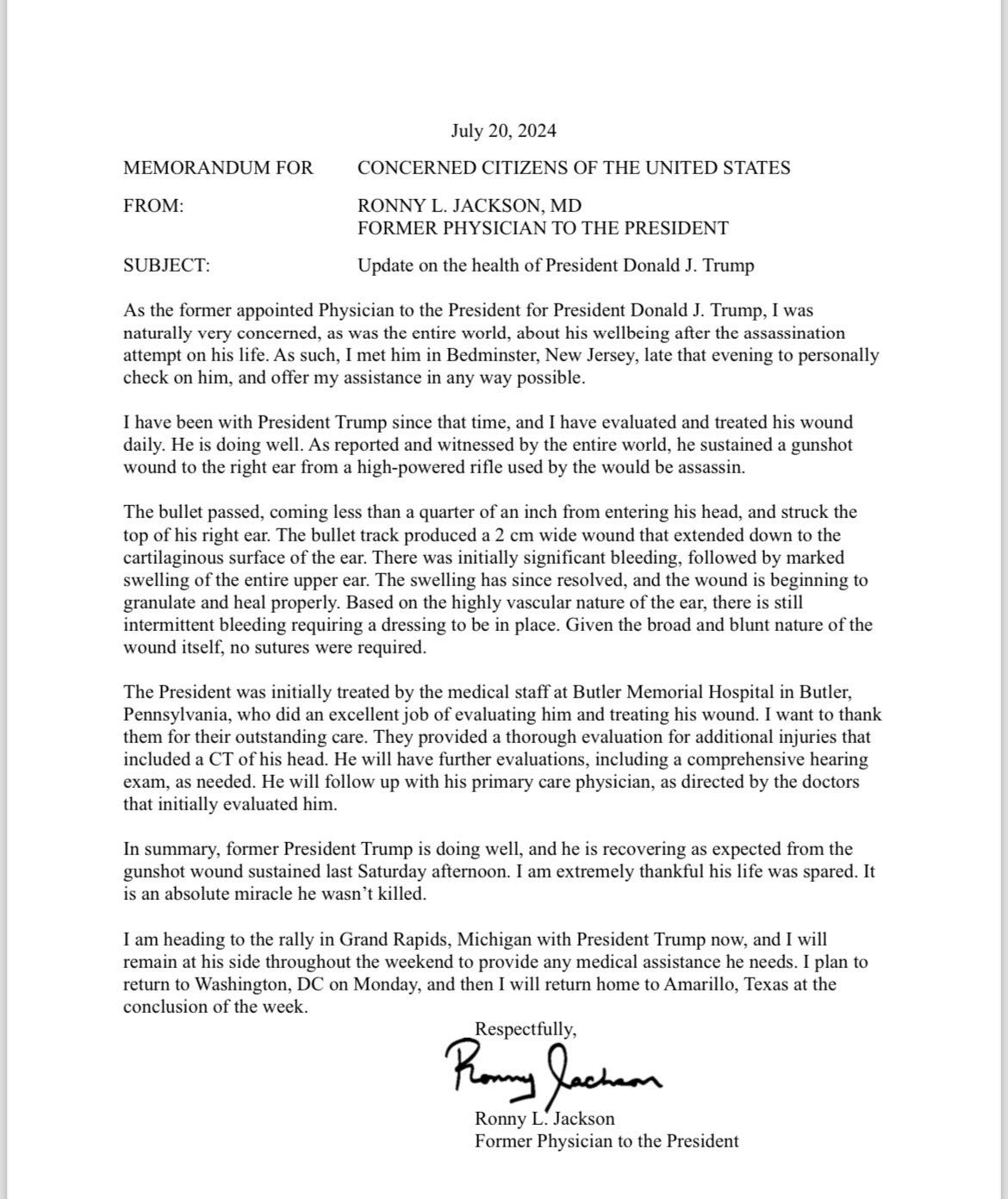 For a moment, let’s put aside the truly jaw-dropping fact that Americans have heard nothing from the hospital that treated Donald Trump after what has been described as an assassination attempt. There’s no precedent for Americans being kept in the dark about the emergency medical treatment of a presidential candidate under these circumstances, but let’s leave that aside. Let us forget, too, that Trump has insisted on being the only one in his political campaign to address the incident in public, with the exception of his now-disgraced former doctor Rep. Ronny Jackson (R-TX), whose name Trump cannot recall and who, when he isn’t on Twitter inciting violence among Trump supporters, spends his time fending off robustly confirmed evidence that he ran an illicit pill dispensary in the White House that President Trump himself may have frequented for all we know. The only thing we need to know about Jackson is that as Trump’s doctor (and afterward) he said whatever he had to say about Trump to advance his own, now realized political aspirations; his lackadaisical, unprofessional assessment of Mr. Trump’s injuries in a post-Butler memo that is squarely a political document rather than a medical one can be easily ignored.