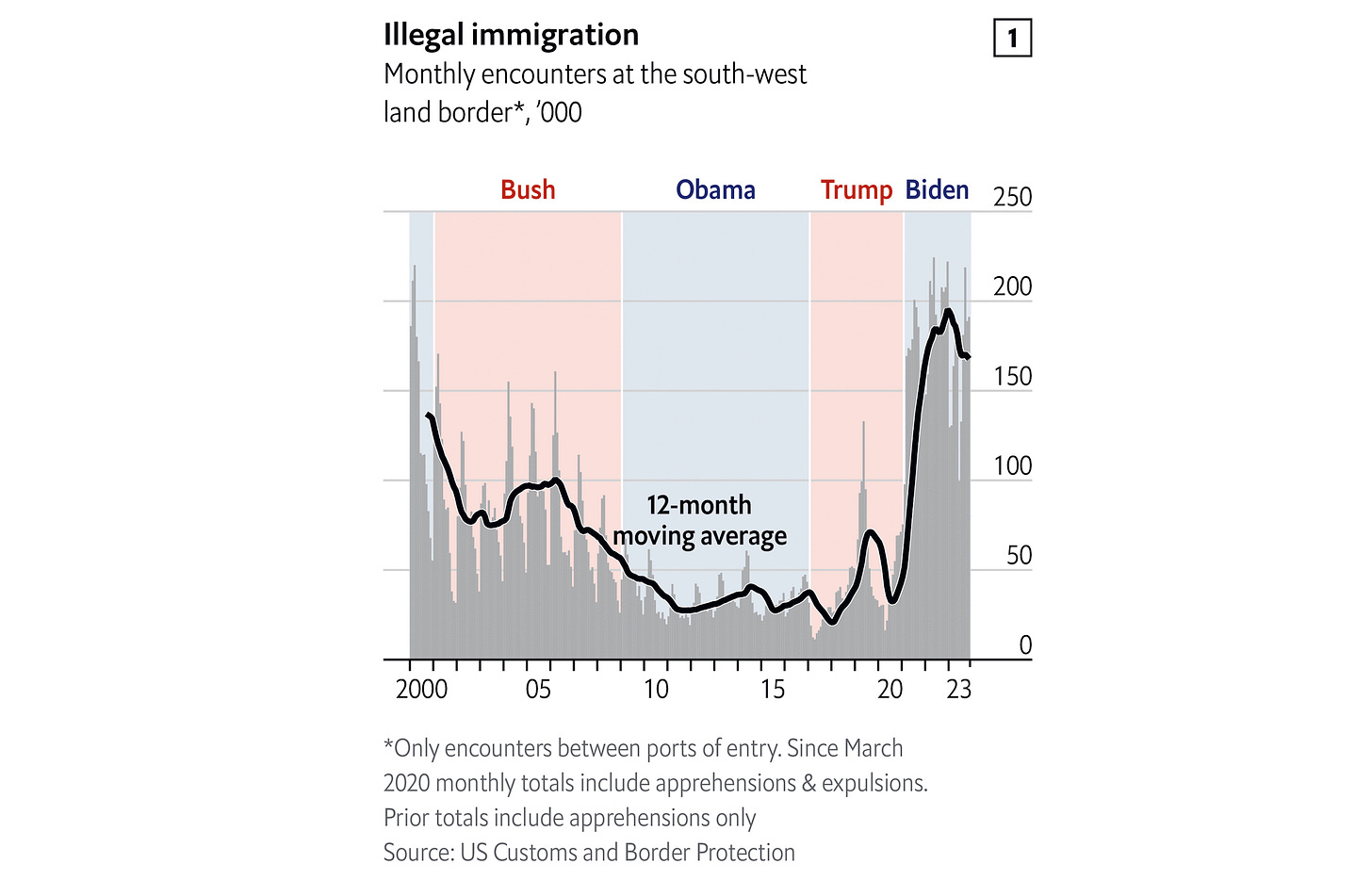 (11) No, Trump was not proud of the record he left on immigration. He was proud of the false record he pretends he had on immigration—a critical difference, as we will soon see. As you can observe below in a chart published by The Economist, as Trump left office illegal southern border crossings were increasing at an alarming rate after a drop that was due almost entirely to the pandemic and not at all to anything Trump had done. His internal analyses while he was president would have shown him just this, not anything for him to crow about at a campaign rally years later in 2024.