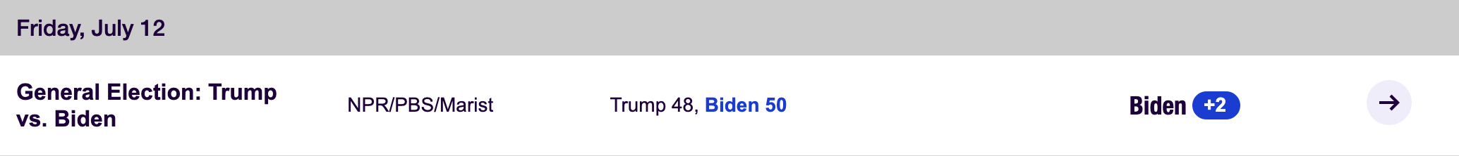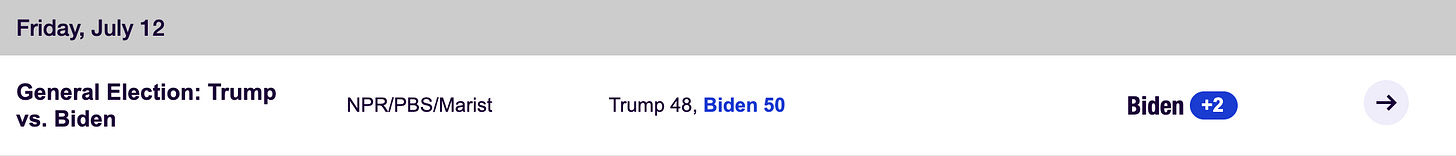 So why does Trump chose to tell this lie? Because it gives Crooks a motive to want to kill him, at least as the poll-obsessed Trump would see it: a desperate desire to stop a presidential campaign cruising at full steam toward victory. But in fact, if Crooks had been an obsessive fan of the sitting POTUS (which he wasn’t; he was a registered Republican from a Trump-supporting family who was part of a Trump-supporting friend group and, according to his classmates, expressed notably conservative views whenever he did mention politics) wouldn’t have chosen July 13 to try to insinuate himself into the 2024 U.S. presidential election—because that date was a high-water mark for President Biden.