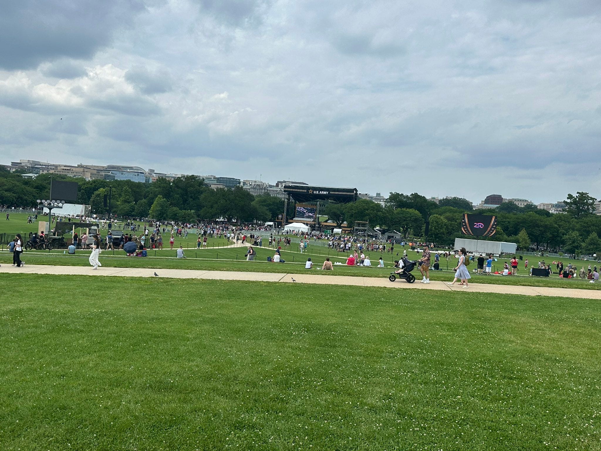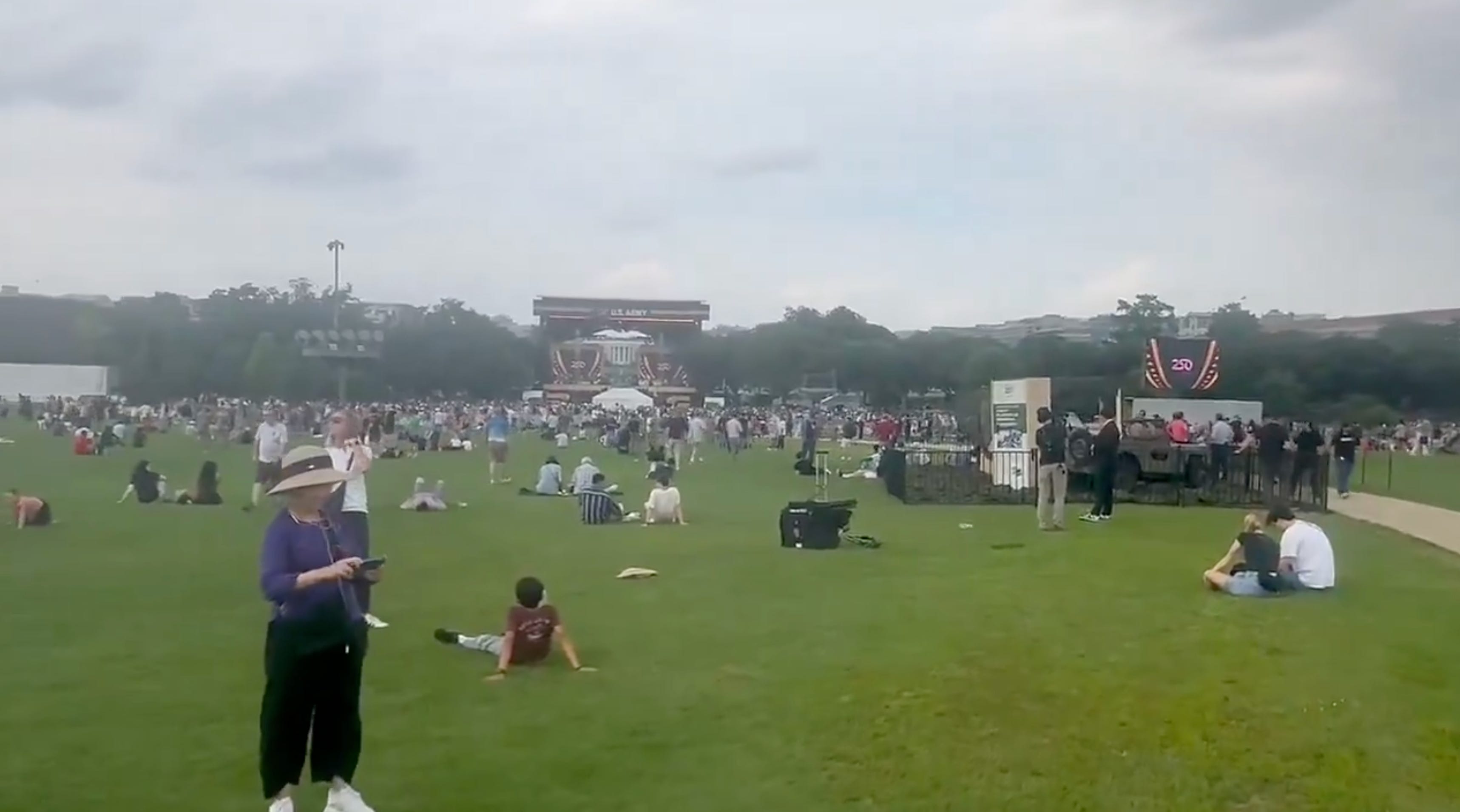 Yes, the structure at the background of the bottom photo is the Presidential Viewing Stand; so in looking at the photo you are, in fact, looking at the very thickest part of the paltry crowd at Trump’s birthday bash. Even as his fans crowed online that the claimed attendance (apparently a White House-provided figure) was 200,000—if past is precedent, the White House was simply using a jazzed-up version of the number of meaningless digital RSVPs as an attendance quote—observers, including this author, suspect that the total number of attendees was likely in the thousands only. (And if this is to be believed, which is a mystery as yet unsolved, some of those in attendance may have been paid as seat-fillers; certainly, Donald Trump loves to secretly do what he has long accused his political opponents of doing, and he continues to falsely say that Democrats pay protesters when in fact he’s the only U.S. politician who has been caught doing so in recent years.)