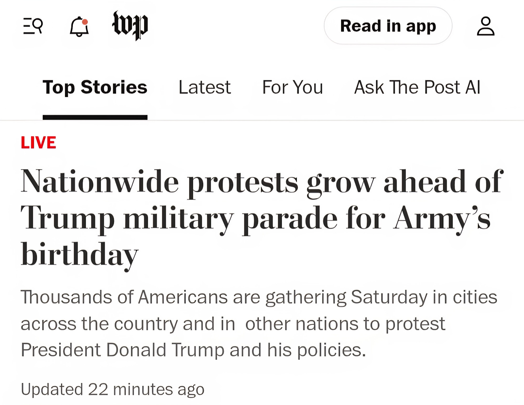 On the subject of The Saddest Parade in History, it’s the one that happened in D.C. as the nation was protesting Trump’s openly fascist agenda. Trump aimed to celebrate his birthday (a birthday that makes him about the age Joe Biden was when Mr. Trump began saying Biden was too old to be President of the United States) by spending tens of millions of taxpayer dollars and causing tens of millions in damage to Washington’s roads on a parade that was short in every way imaginable. It was short timewise and it was short in terms of its route, which was only 1,600 meters.