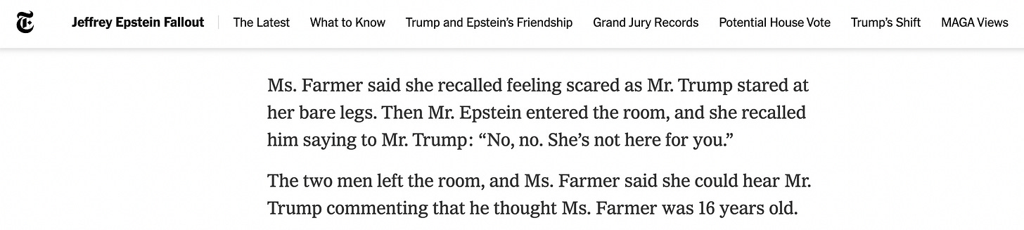 Whatever Trump did with underage girls is enough for him to have had his very first public response to Epstein’s death be, per the New York Times, “sharing a social media post that attempted to link the death to Bill Clinton. Days later, when pressed about his unfounded claims of Clinton’s involvement, Trump did not let up, calling for a full investigation, even though he offered no facts to support his allegations.”