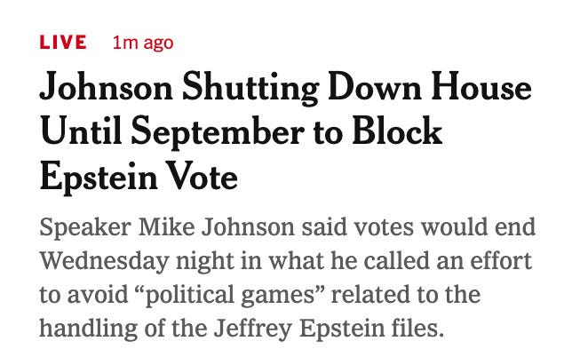 Trump is in fact so spooked by what’s happening right now that he’s gone five days without being willing to answer even one question about Epstein—and Trump loves the spotlight, no matter the topic—such that on July 22, per a New York Times report,