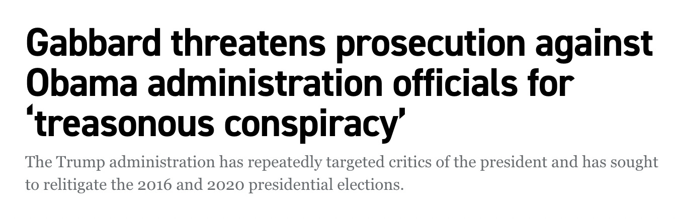 And whatever Trump did with underage girls is enough for him to try to distract from it by repeatedly promoting on social media platforms plans by Director of National Intelligence Tulsi Gabbard to recommend the near-term arrest and seek the execution of a former President of the United States and his top officials on an imaginary charge of Treason. Thus this Politico headline and a thousand others like it, a number of them pushed by Donald Trump on his Truth Social site:
