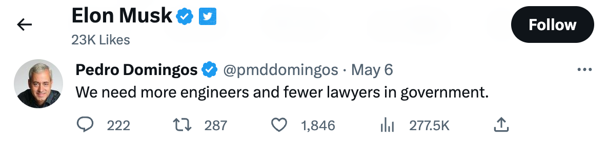 As if to drive the point home, Musk “liked” a tweet opining that America needed more engineers—people like Musk—in the corridors of power in Washington, D.C., and fewer people from the profession that has dogged Musk his entire professional life due to the many, many allegations of illicit and illegal conduct against him: lawyers.