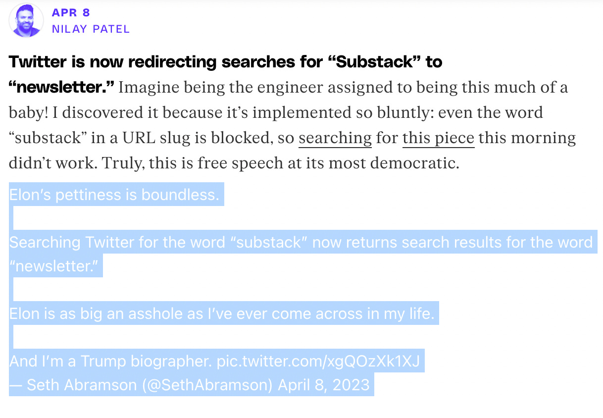 “The reactions to Elon Musk’s actions were not long in coming. Donald Trump biographer Seth Abramson wrote, ‘Elon’s pettiness knows no bounds. Searching Twitter for the word “substack” now returns search results for the word “newsletter.” Elon is the biggest asshole I’ve ever seen in my life.’”