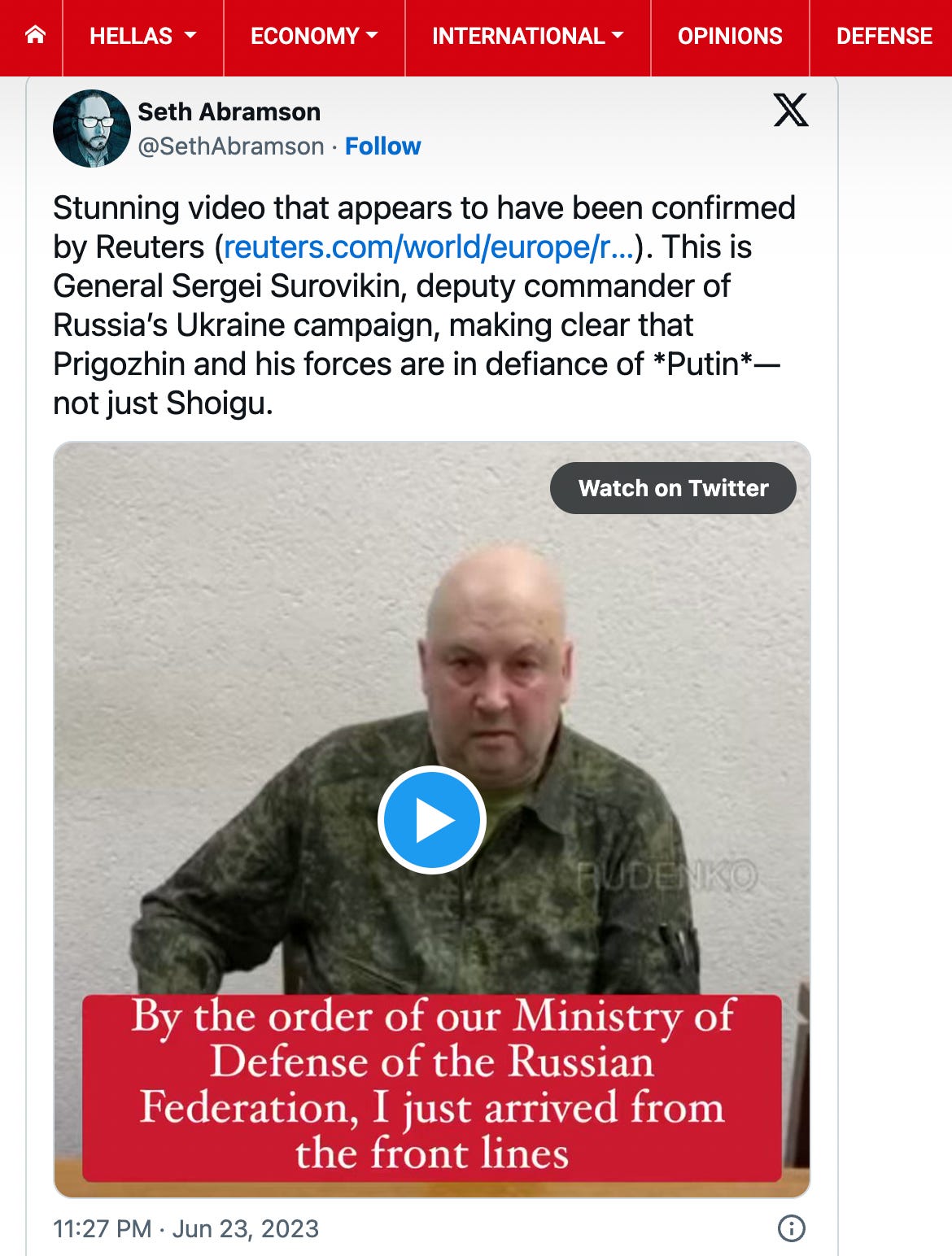 Title: “Russian Armed Forces’ #2 Knew in Advance of the Wagner Mutiny, Rumors That He Is Now Being Interrogated” (link)