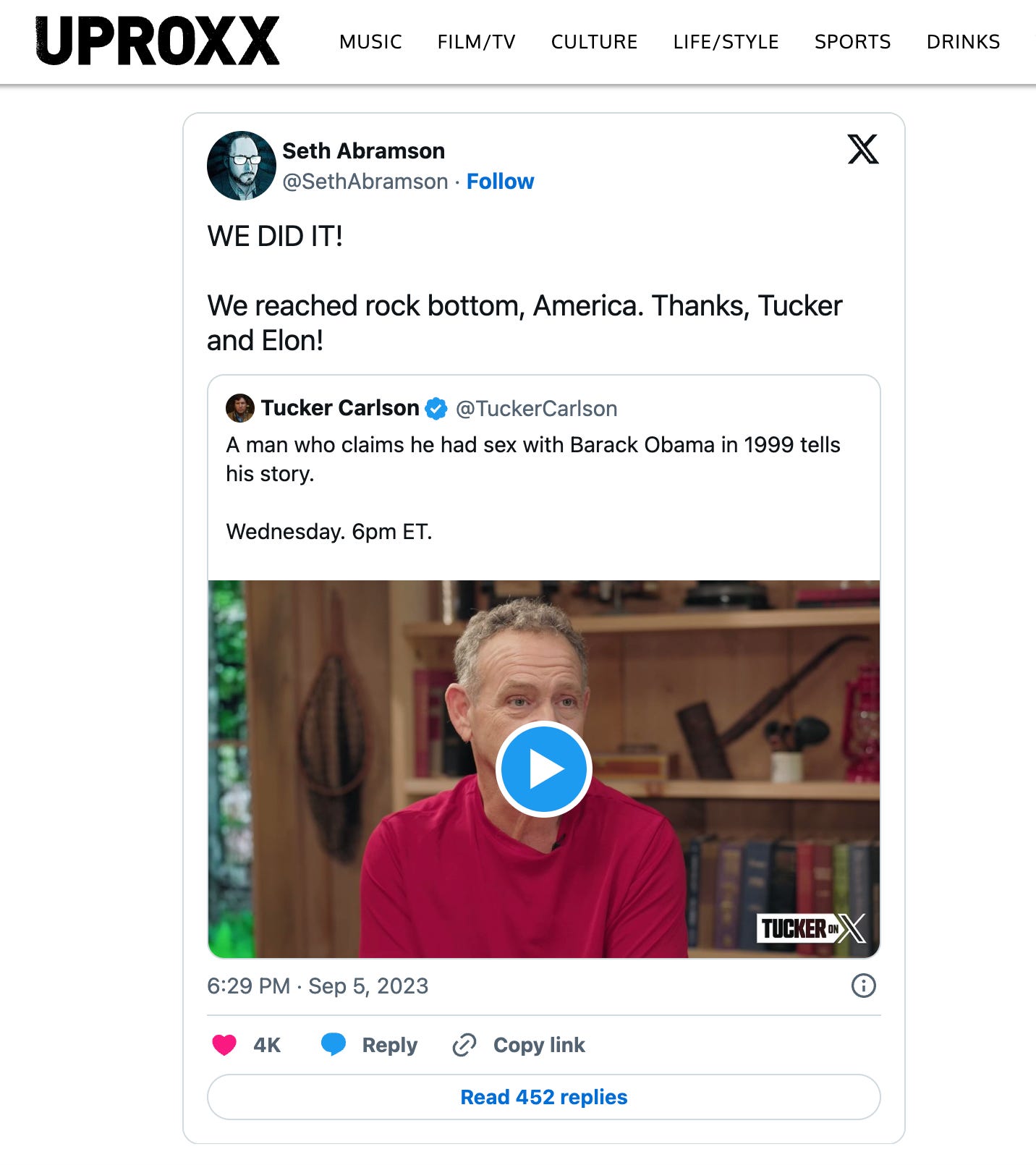 Title: “Tucker Carlson Has Reached A New Low By Interviewing a ‘Con Artist’ Who Claims He Did Drugs And Had Sex With Barack Obama” (link)