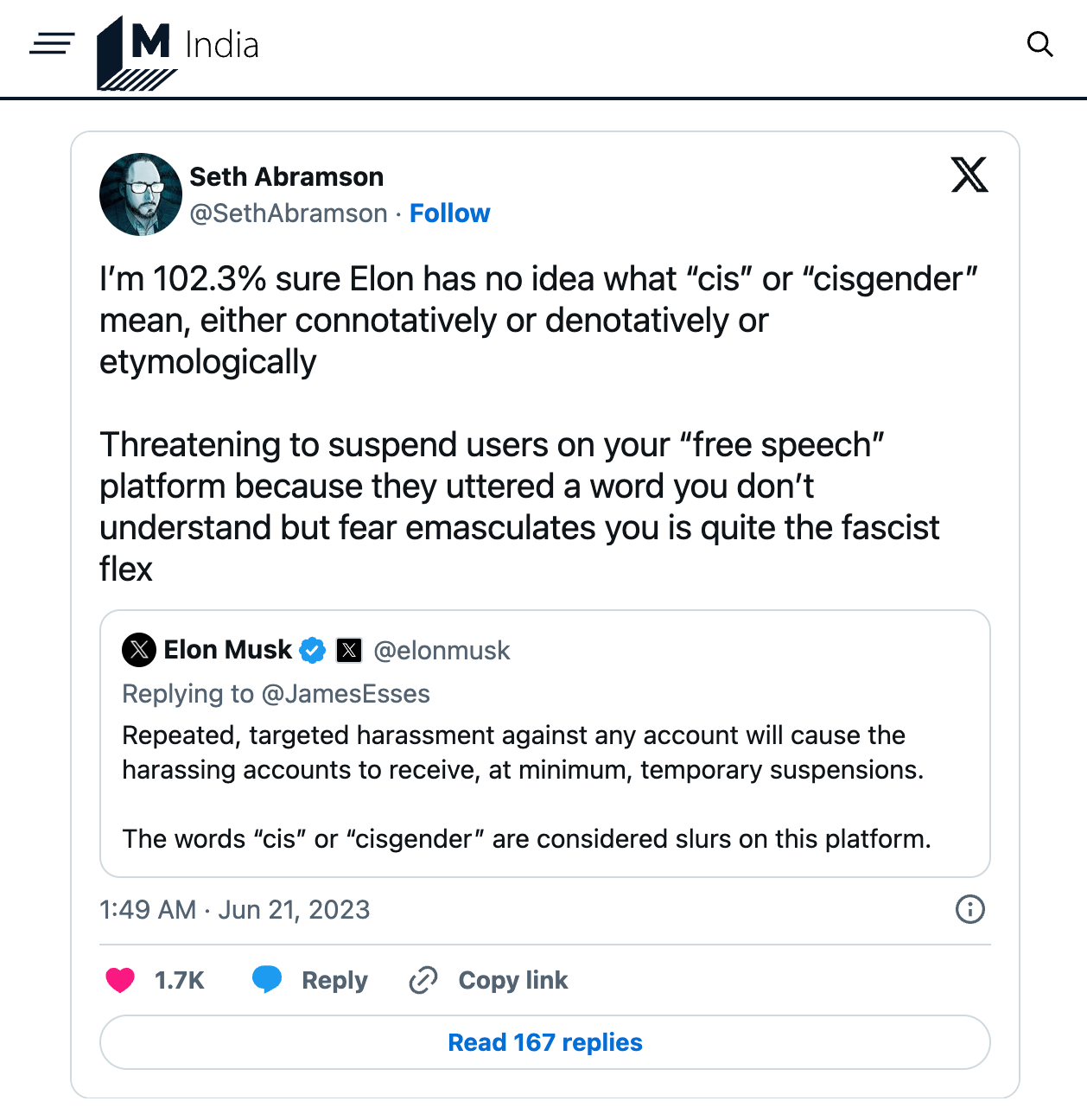 “‘I’m 102.3% sure Elon has no idea what “cis” or “cisgender” mean, either connotatively or denotatively or etymologically’, New York Times best-selling author Seth Abramson wrote. ‘Threatening to suspend users on your “free speech” platform because they uttered a word you don’t understand but fear emasculates you is quite the fascist flex.’
