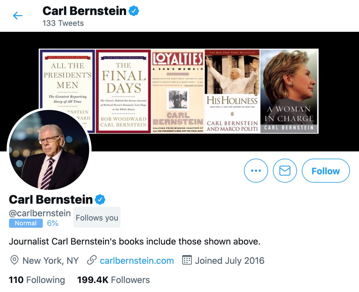 Carl Bernstein is my journalistic hero. He follows about a hundred people on Twitter.
