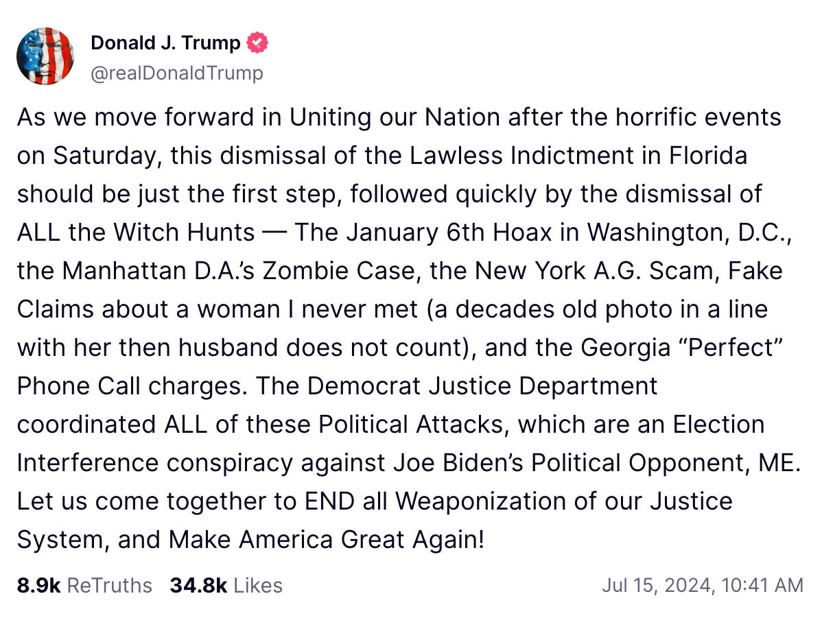 It’s now clear that American voters will be asked to decide on the fitness for office of a man with 54 untried felonies, and because major media persistently wrongly deploys the “innocent until proven guilty” mantra of our justice system—to be clear, a mantra that only applies to jury duty, as voters are allowed to judge a man however they wish—it is likely that few in the media will point out that no responsible voting population can ever vote for a man with 54 untried felonies. To do so is civic malpractice. More likely, what we will hear from American major media is that Trump looked like a real badass in photos taken immediately after his attempted assassination in Butler, Pennsylvania.