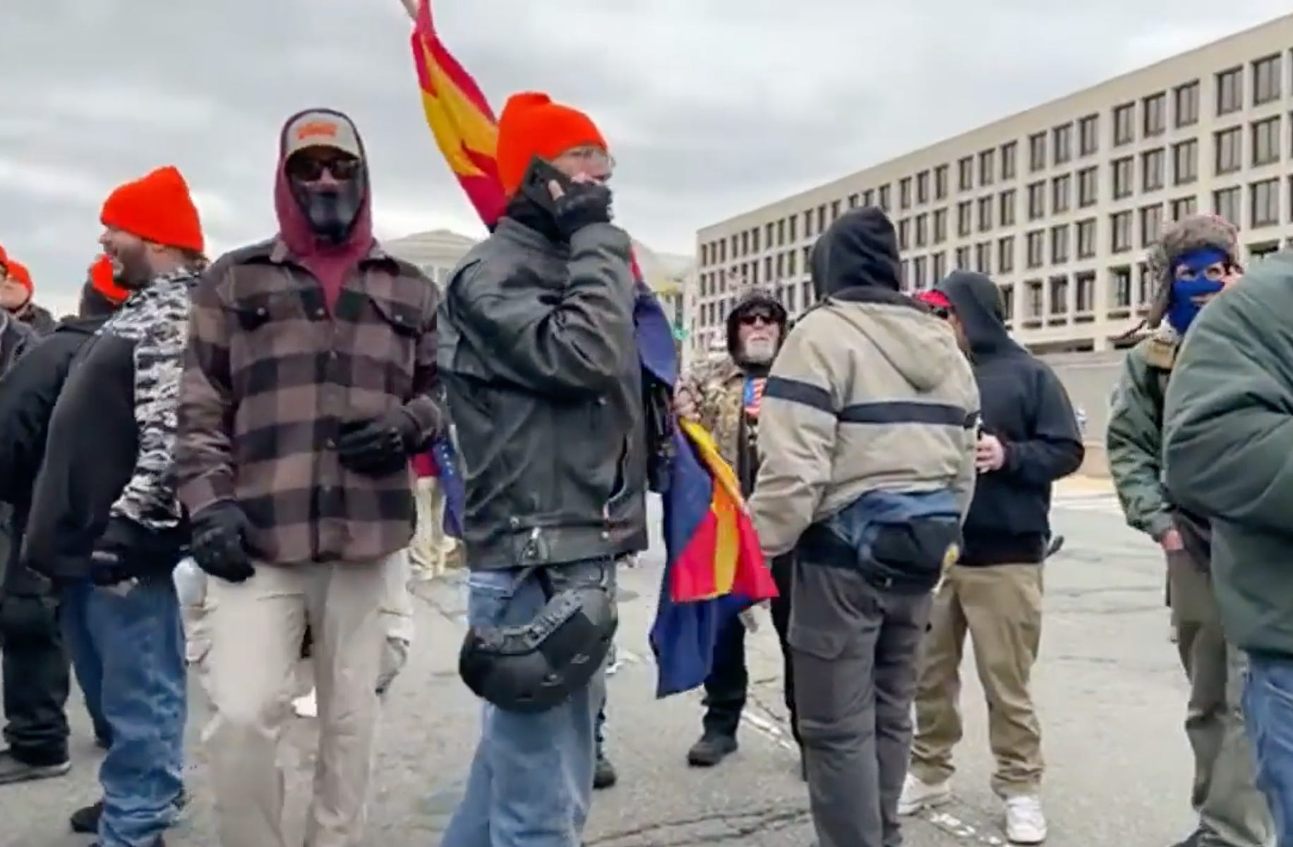 (16) Ali Alexander’s Arizona Proud Boys stand out. Nearly all the Arizona Proud Boys are wearing blaze-orange hats like Alexander’s January 5 hat; most are also armored. One of the flag-bearers in the group—there are two carrying the flag of the State of Arizona—is wearing an earpiece and has a two-way communications device, raising the question of whether he’s in direct contact with Alexander, who we know (see prior Proof reporting) has told Alex Jones in a publicly available interview that he was in contact with the Trump campaign during the insurrection. If indeed the Arizona Proud Boys are linked up with Alexander in this way, it means the Proud Boys could receive commands from the Trump campaign near-instantaneously mid-insurrection.