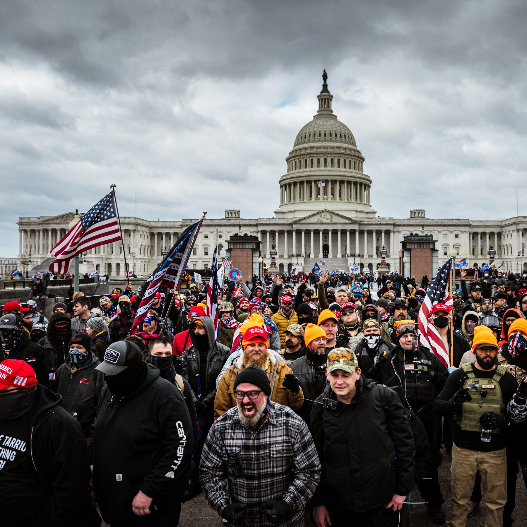 The milling crowd of President Trump supporters had taken his invitation to march on the Capitol, but upon arriving at the steel fencing at the edge of the building’s western lawn, they seemed unsure of what to do next. Then, at 12:48 p.m., a clutch of men in blaze orange hats and military-style vests turned a nearby street corner, marching straight toward them. In a matter of moments, the two groups merged and the crowd swelled to hundreds and surged forward, toppling a metal barricade at the curbside and charging up two small flights of stone steps toward five startled officers of the Capitol Police. The outer security cordon had been breached, and the first siege of the nation’s Capitol by U.S. citizens had begun.