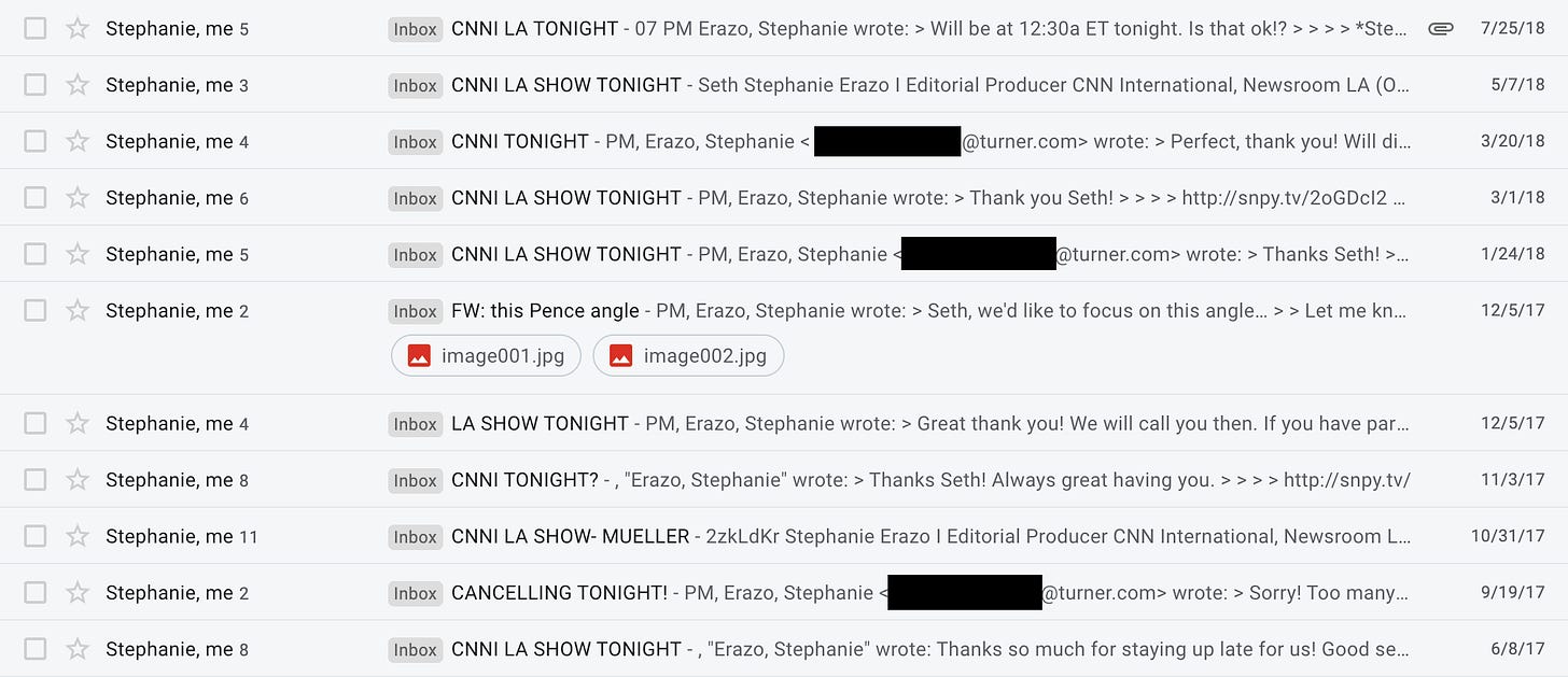 When I read your four conspiracies on Twitter and then saw them on Cuomo's show, I had a feeling you were in contact with them or Cuomo was reading your feed. I remember in the past telling Cuomo (via Tweet) you needed to be on his show and he would not regret having you visit. Thank you again Seth for all you do and I have found my journalist to follow and support (you).