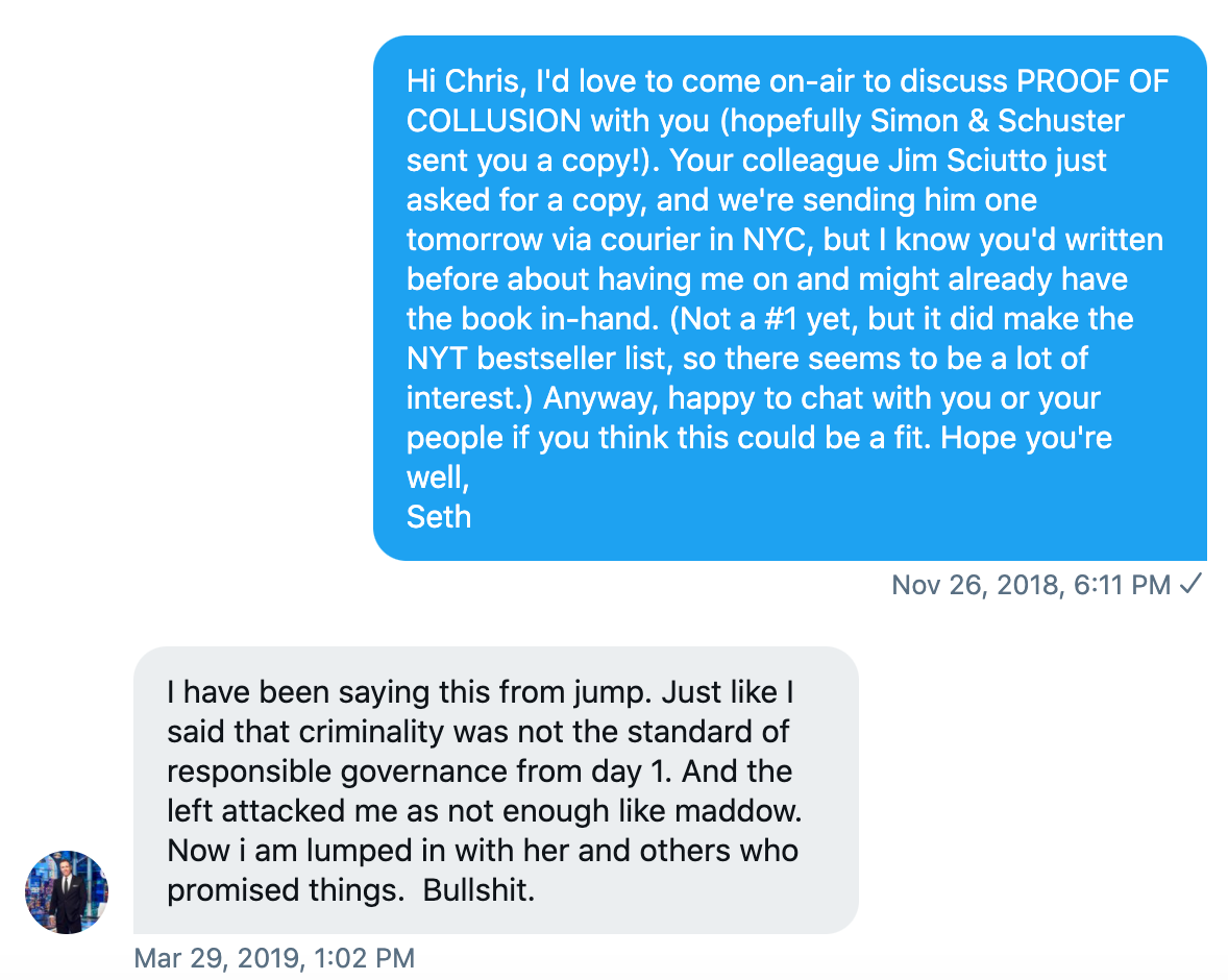 My next contact with Cuomo was in November 2018, and candidly wasn’t really by choice: my publisher at the time, Simon & Schuster, was pushing me to get on-camera on a major media outlet to promote Proof of Collusion, and while normally I don’t like to ask people for things, Jim Sciutto asking me for a copy of my book (as well as my many free appearances on-air at CNN) made me feel like proposing a spot on Cuomo’s show, given his prior statements to me, wasn’t out of line. Thus, this odd exchange: