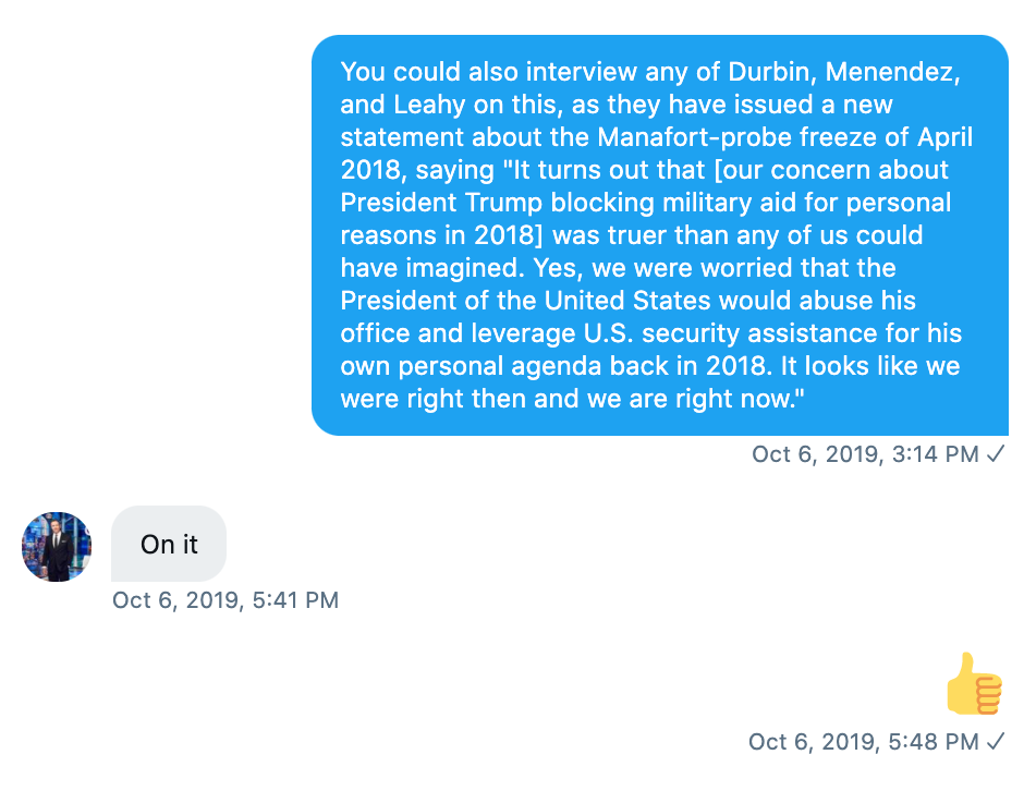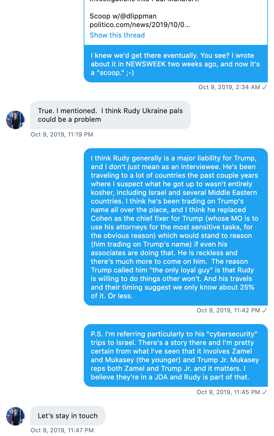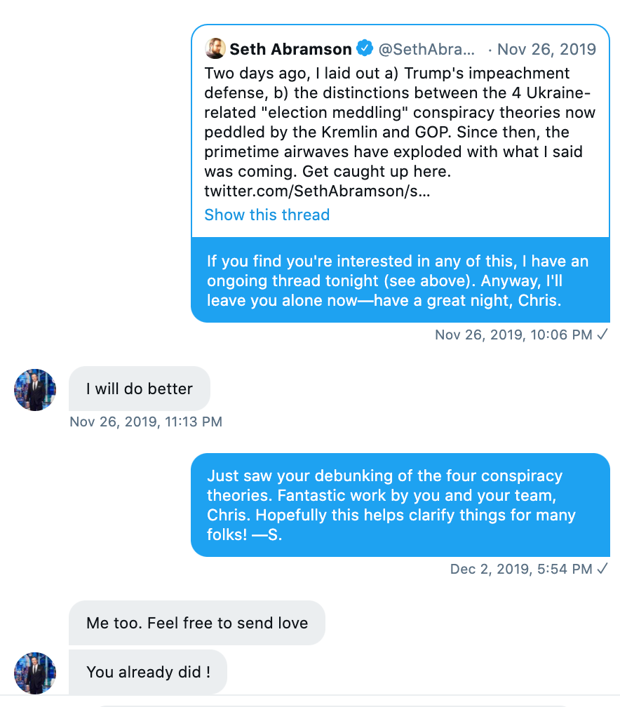 I wrote back “Sure, sounds good”, and didn’t write Chris again for a month and a half. In late November 2019, I became frustrated that major media was failing to distinguish between four distinct conspiracy theories Trump and his allies in Russia were pushing about the 2016 and 2020 presidential elections. I sent Cuomo three of my threads. This screenshot (which includes the last of my DMs to him) lets you know what happened: