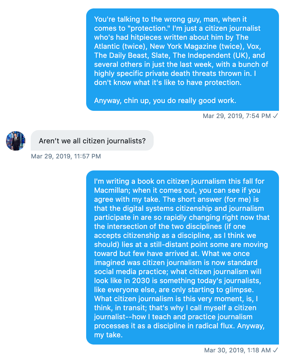 As the author of a forthcoming book on citizen journalism, did Cuomo repeating the old canard that we’re “all citizen journalists” disappoint me? Sure. But I know how academics get—we respond too heatedly to people not knowing as intimately as we do topics we’ve been studying for years—so I didn’t have much of a reaction to his (as I considered it at the time) slip-up.